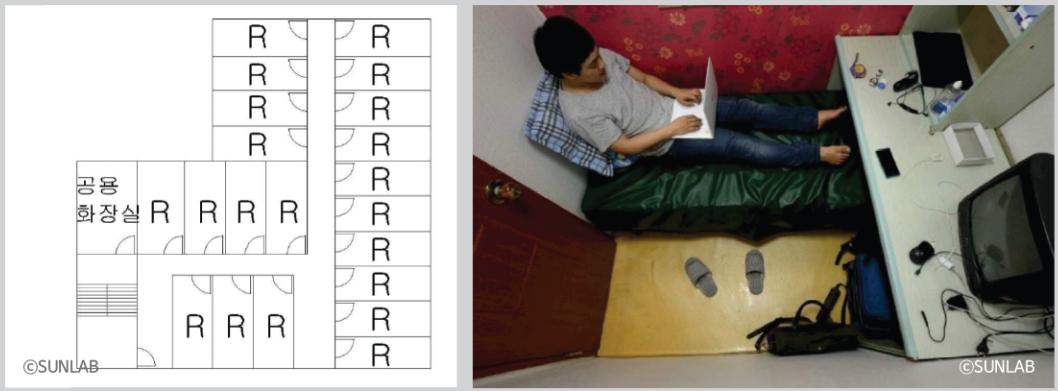 이곳은 원래 고시원이었다. 건물 주출입구 뒤편에 '에벤에셀 고시원' 간판이 붙어있는 이유다. 그런데 사법고시가 폐지되면서 고시원의 공실률이 늘어났고, 선랩건축사사무소가 이곳을 찾았을 때는 네 명만 살았다고 한다. 방은 총 44개가 있었다. 방의 크기는 성인 남성이 겨우 누울 수 있는, 양 옆으로 팔을 다 뻗기도 힘들 정도로 작았다. 그런 방들이 빼곡하게 붙어있고, 공용공간 하나 없는 삭막한 고시원이었다. 청년들의 열악했던 생활환경을 짐작할 수 있다.