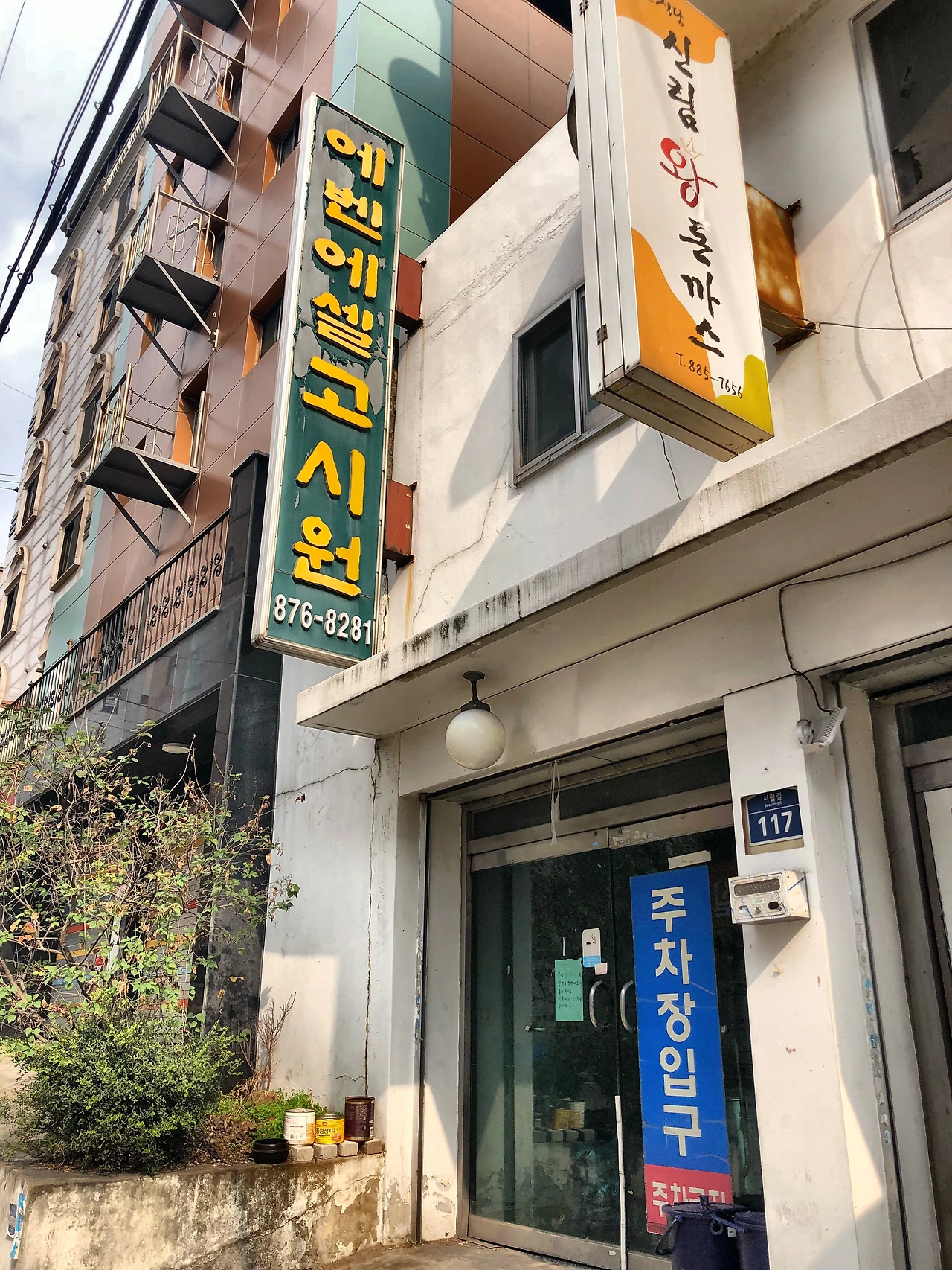 주위를 둘러보며 언덕을 조금 오르니, '에벤에셀 고시원'이라 적혀있는 간판이 보였다. 서림길 라운지가 있는 건물이다. 건물 안으로 들어가기 위해 출입문 앞에 다가서니 뭔가 이상하다. 그제야 유리문에 붙어있는 문구를 발견했다.