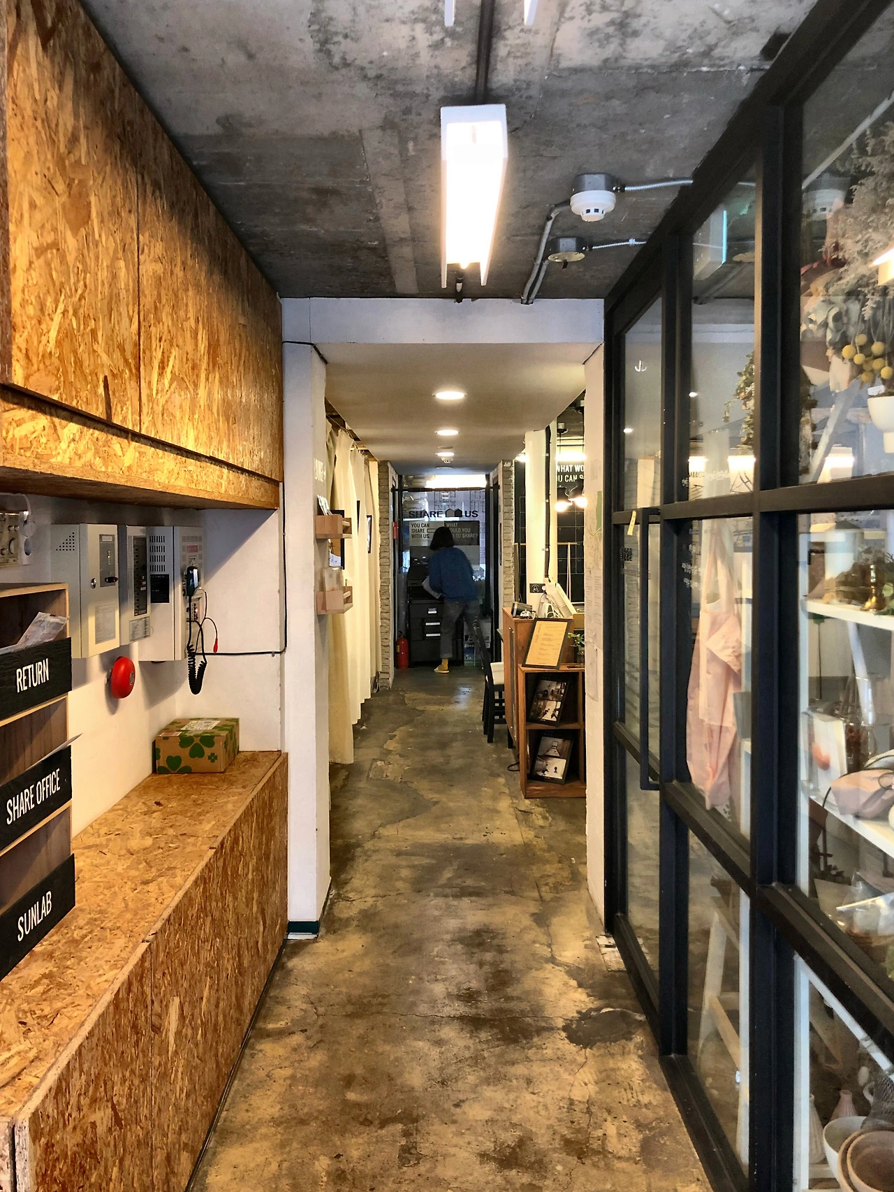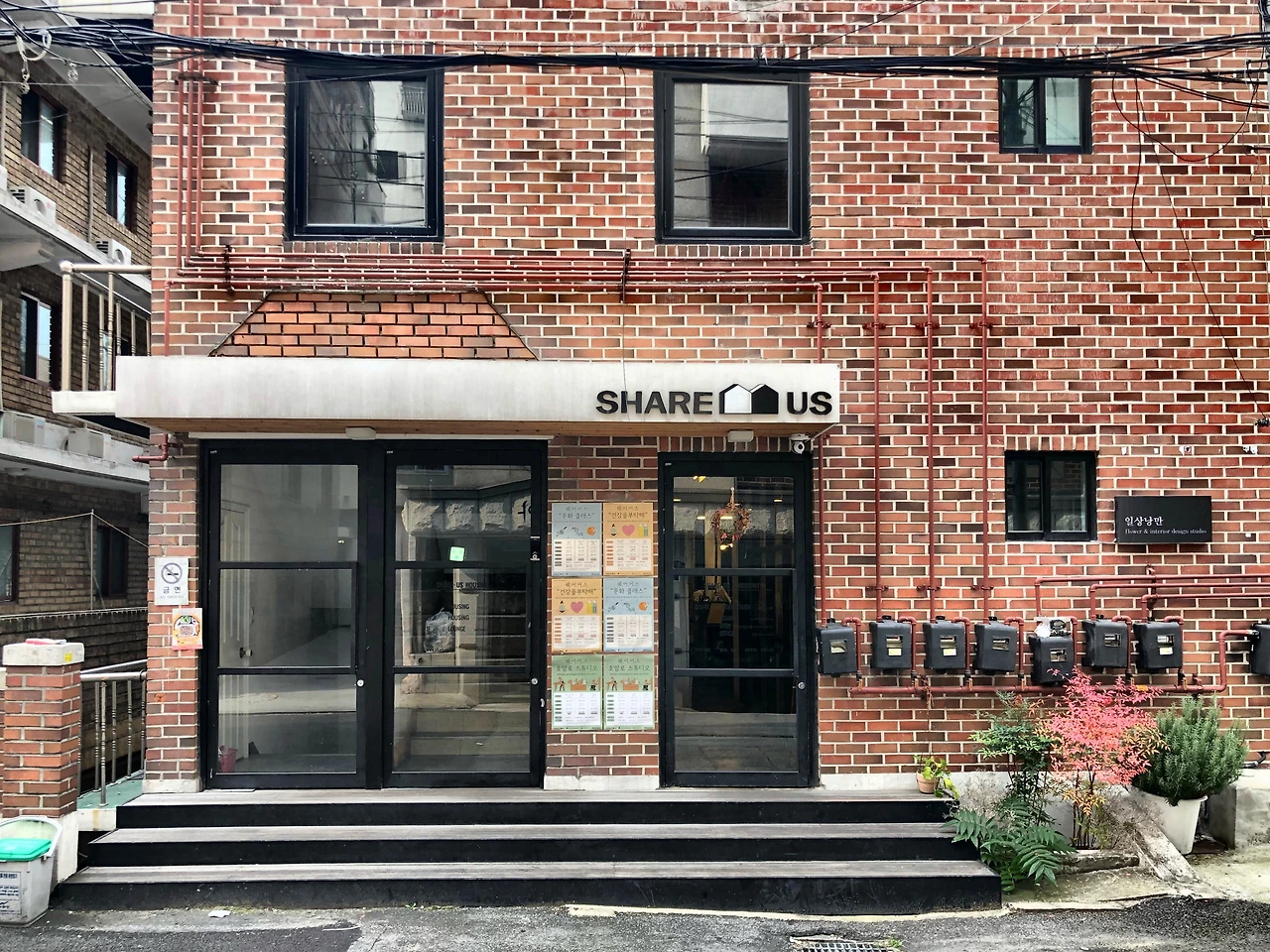 건물 앞, 뒤에 출입문이 2개 있는 건물이라니. 출입문부터 호기심을 자아냈다. 그렇게 '진짜 출입문'을 찾아 건물 뒤편으로 갔다. 곧 빨간색 벽돌 건물이 보였다. 간판에는 'SHARE US'라고 적혀있다. '서림길 라운지' 간판은 어디서도 찾을 수가 없다.