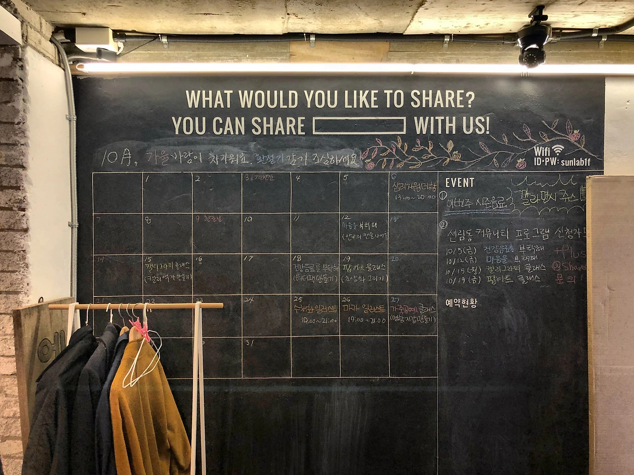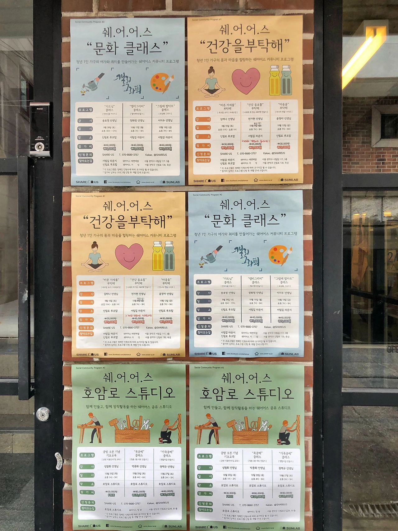출입문 옆을 보니, 빨간 벽돌 위 포스터가 붙어있다. 쉐어어스에서 진행하는 프로그램이다. 캘리그래피, 가드닝, 팝아트, 목공예, 가죽공예 등 청년 1인 가구의 여가와 취미를 만들어가는 프로그램이다. 이밖에 자세 교정, 건강 음료 만들기 등 몸과 마음을 힐링하는 클래스도 있다.