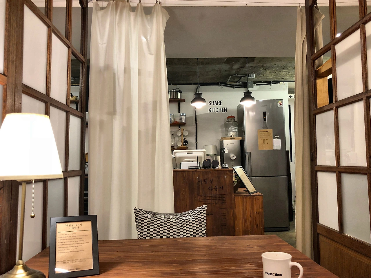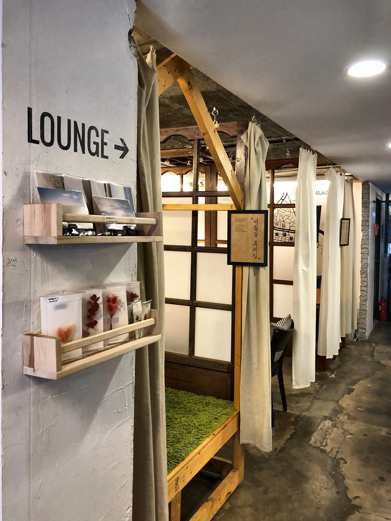 주 출입문을 열고 들어가니, 기다란 통로 너머 부엌과 하얀 커튼으로 구획된 공간이 보였다. 이 곳이 서림길 라운지이다.