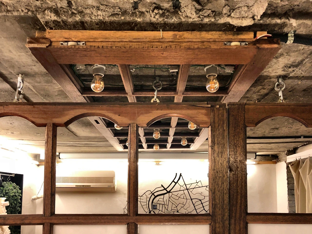 쉐어어스 곳곳에 벽과 기둥을 헌 흔적이 보인다. 라운지 곳곳에 시간의 때가 묻은 인테리어 자재들이 눈에 띄었다. 선랩 공간 디자이너분에게 있어 물어보니 이곳을 리모델링면서 나온 폐자재들을 업사이클링했다고 한다. 테이블에 쓰인 나무들, 파티션 역할을 하고 있는 나무 문짝, 천장에 있는 조명 장식물 등이 이렇게 새 쓰임새를 얻었다.