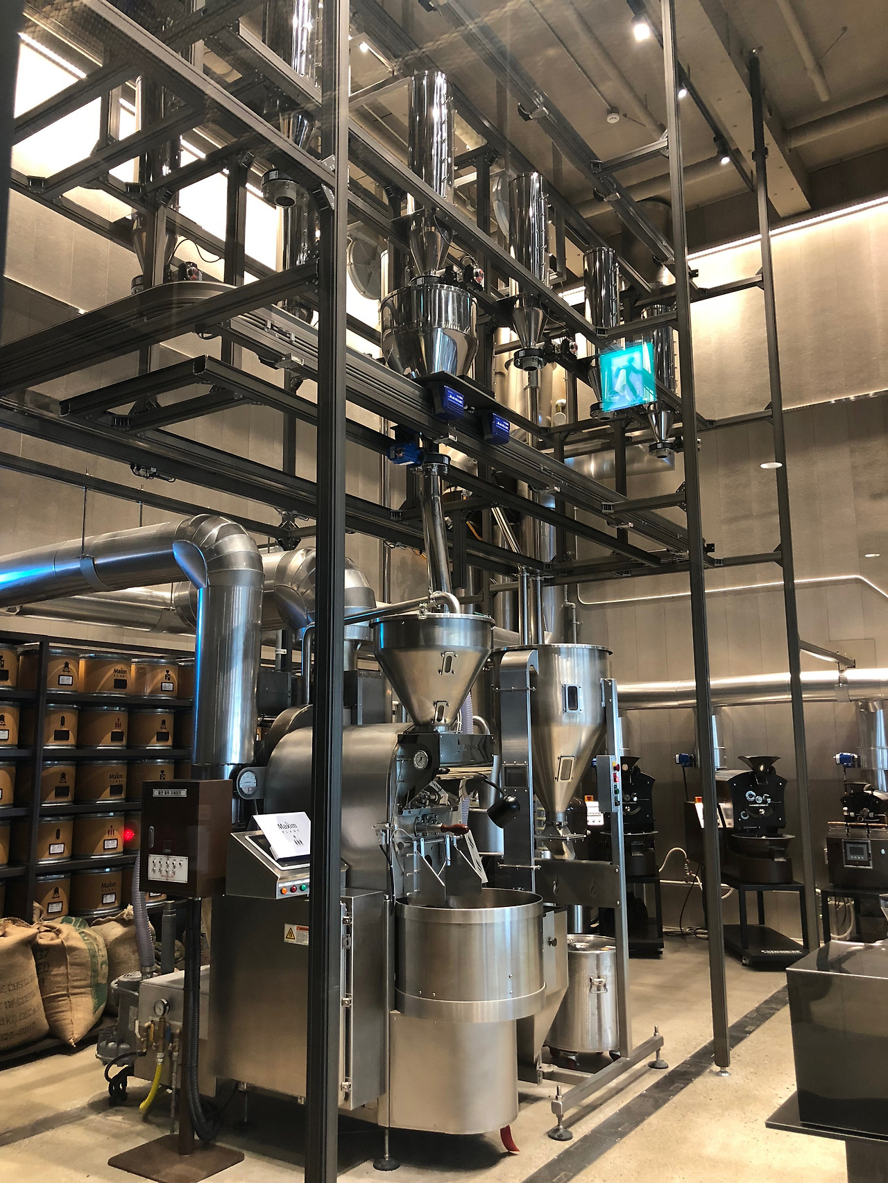 프로덕션 플랜트의 경우, 지하 2층 커피랩에 있는 로스팅룸(사일로가 있는)이 콘텐츠가 약했습니다. 제가 갔을 때 로스팅 룸은 들어가서 직접 체험할 수 없었고, 그저 유리벽 너머로 존재하는 기계를 볼 수 있을 뿐이었습니다. 작동하고 있지도 않았고요. 강릉에 있는 커피커퍼 박물관 1층에 위치한 카페가 생각났는데, 거기서는 커피를 마시며 옆에 직원이 기계로 로스팅하는걸 직접 볼 수 있었습니다. 그 모습을 보며 '내가 신선한 커피, 무언가 전문적인 커피를 마시고 있구나'라는 생각이 들어 기분이 좋았는데, 맥심플랜트 로스팅 룸에서는 그런 기분을 만끽할 요소가 부족했습니다.