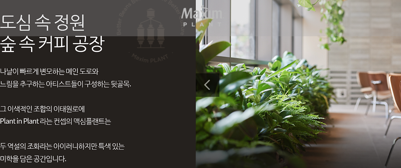 맥심플랜트 웹사이트에서 가장 먼저 보이는 문구입니다. 맥심플랜트의 컨셉입니다. 이름에서부터 아셨겠지만, '플랜트=식물, 공장'이라는 중의적 표현을 맥심플랜트 공간에 그대로 담았습니다. 푸르른 녹색의 식물들을 창가 앞, 계단, 벽면 곳곳에 배치함으로써 '정원'의 컨셉을 살렸고, 공장은 지하 2층에 있는 로스팅 기계와 Steel소재의 테이블, 의자, 매대, 벽면, 철망 커튼 등을 통해 표현했습니다.