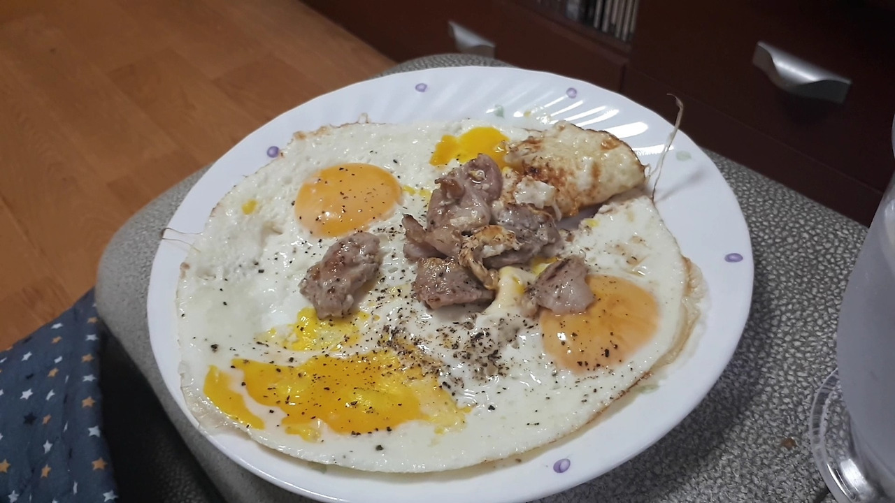 저는 저탄 고지 식사로 돌아왔습니다. 계란 후라이와 목살을 먹었어요.