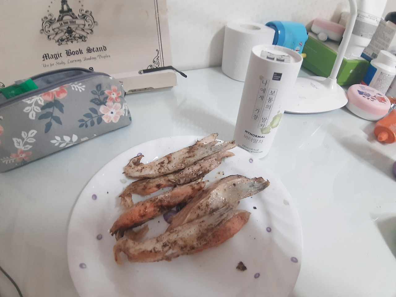 어제와 같은 식단으로 방탄 말차를 먹었습니다. 연어 같은 기름진 생선을 맑은 탕처럼 끓여 먹기도 한다 해서 도전해봤습니다. 음, 맑은 탕은 냉동이 아닌 생물로 하는 걸로! 맛이랄 것도 없었어요. 그냥 비린내 폭탄이었습니다. 소세지의 간간한 맛으로 그냥 삼켜버렸습니다. 아직 심심한 맛을 구현하기에는 제 요리 스킬이 낮은 가봐요.