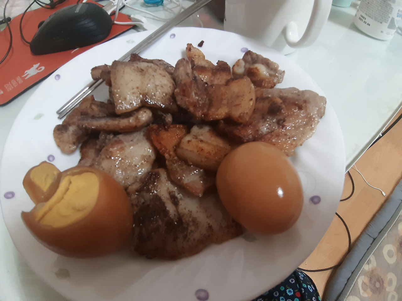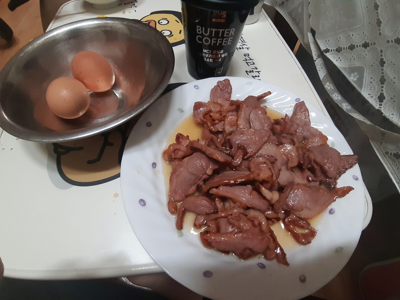 훈제 계란 두 알과 (오랜만에!) 삼겹살이네요. 삼겹살도 감량을 해주긴 하지만 소고기만큼은 아닌 것 같다는 생각입니다. 그렇지만 접근성이 좋고 편리하고 맛있다 보니, 삼겹살은 사랑입니다!