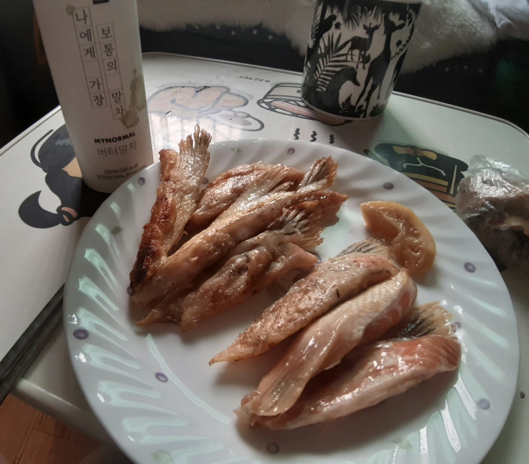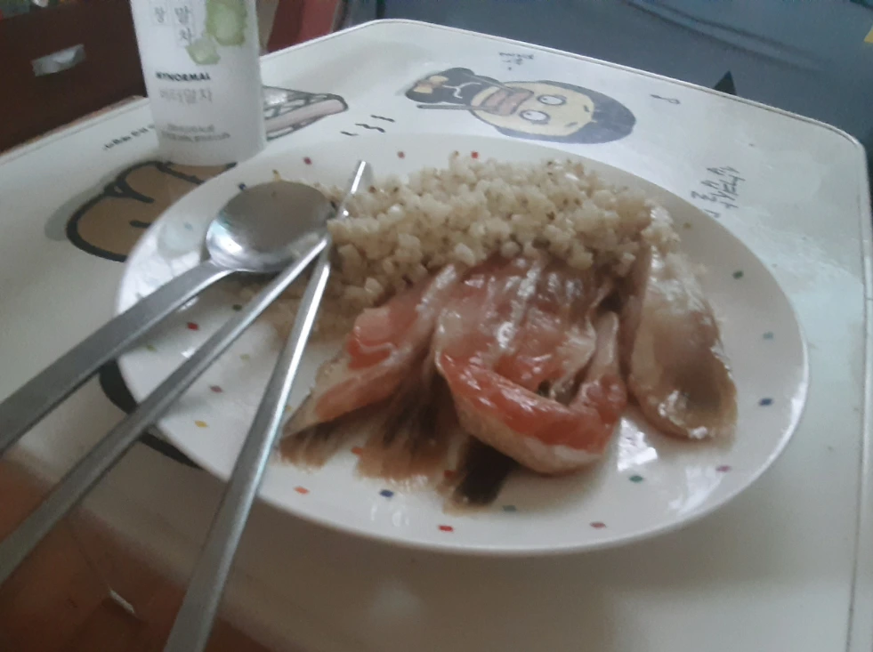 간장 연어장과 연어 구이 그리고 방탄말차를 아침으로 먹고 점심으로 육즙팡팡 소세지를 먹었습니다. 제가 생각보다 육즙팡팡을 많이 먹는다는 사실을 깨달았어요. 그래서 줄이기로 했습니다. 그리고 사진에 보이는 연어 양 보기보다 너무 적어요, 뼈 제거하고 하면 먹을 것도 없을 거 같아요. 차라리 연어 많이 먹고 소세지 먹지 말 걸 그랬어요. (질 좋은 음식을) 많이 먹는 것에 죄책감 느낄 필요 없는데 아직도 많은 양을 먹는다는 것에 거부감이 있나 봐요. 흠, 고민되는 문제네요. 사실은 저 연어들도 너무 많다고 생각해서 덜 구울까 했거든요.