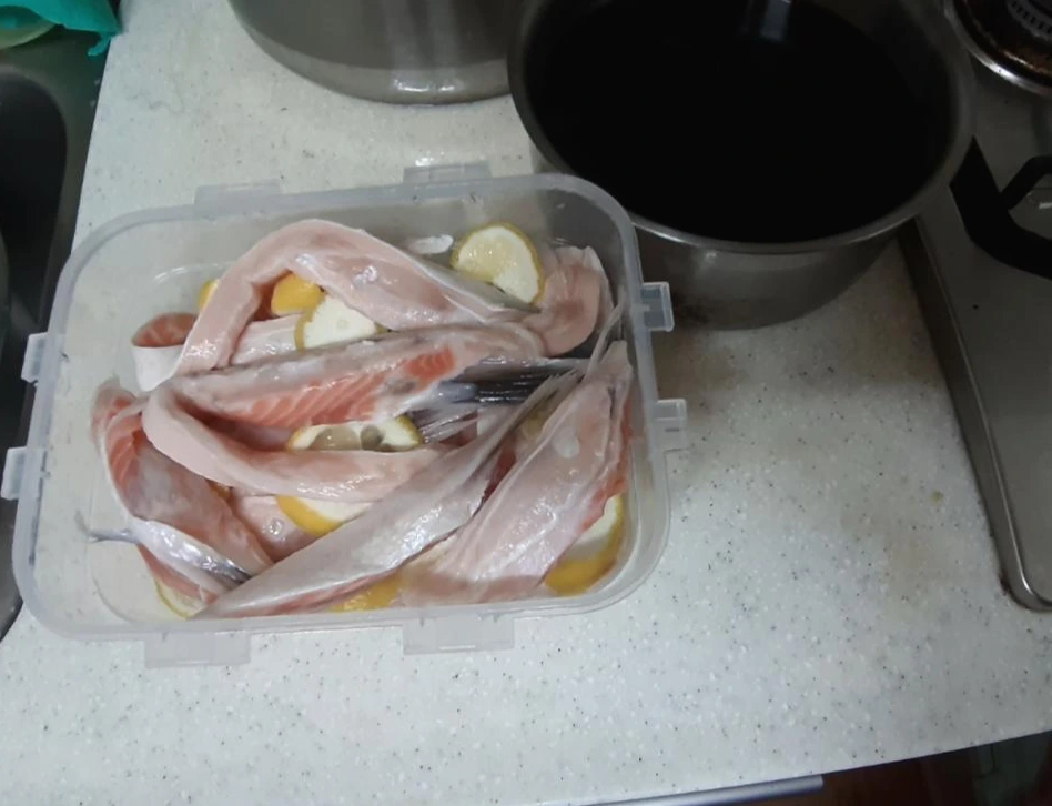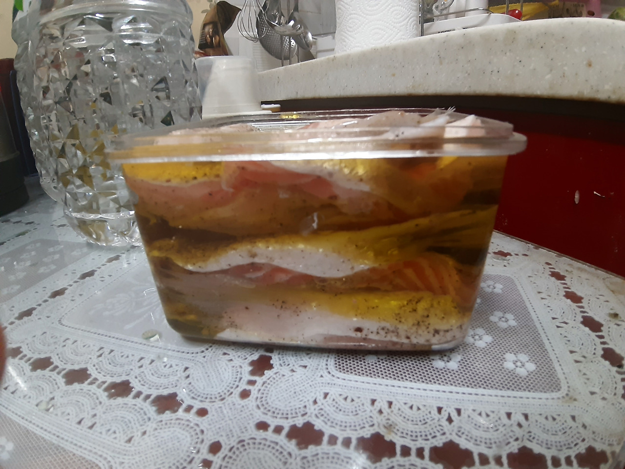 그래서 조만간 남은 연어들을 처리해야만 한다. 그래서 연어를 오일에 재워 보관하기로 했다.