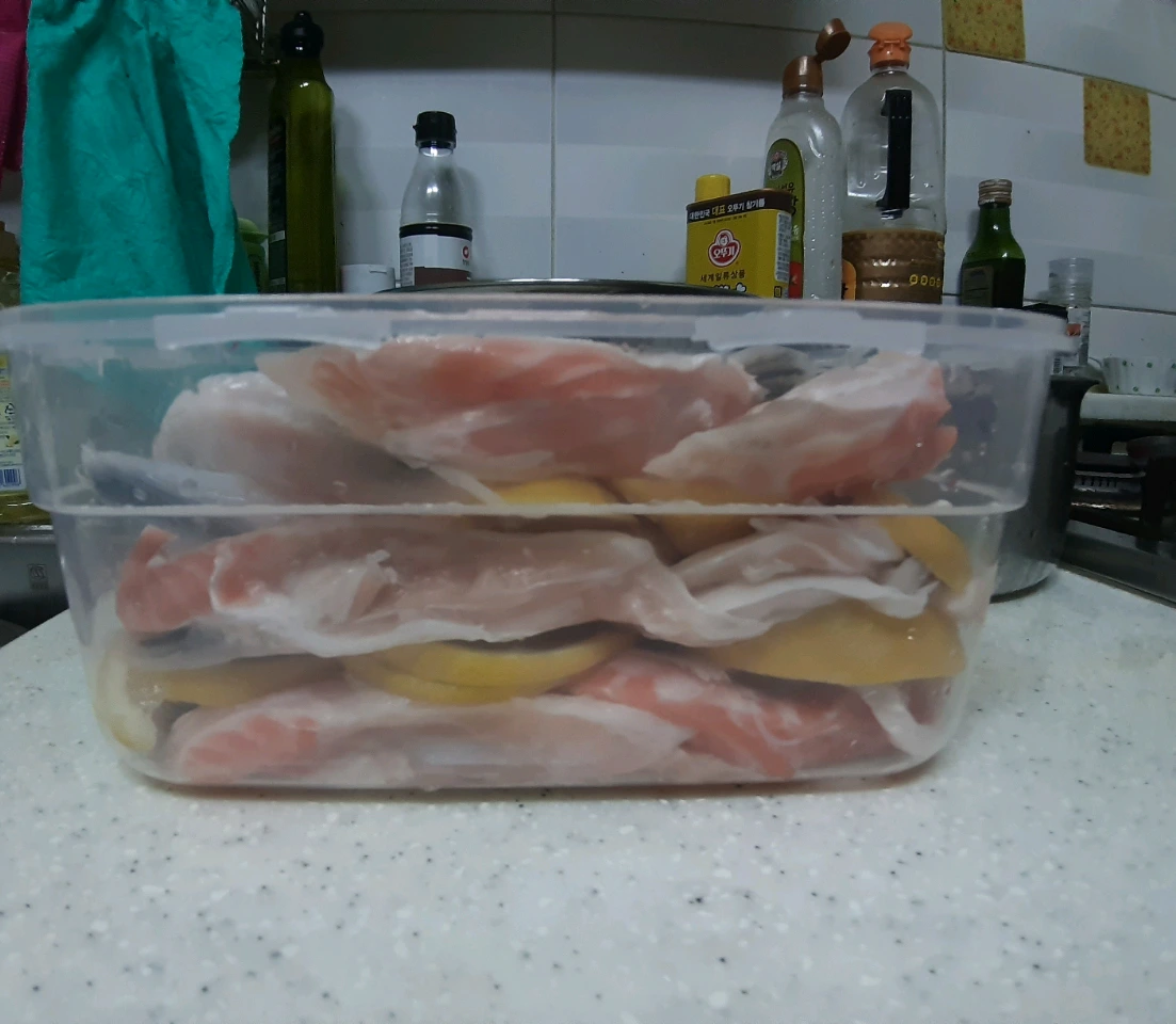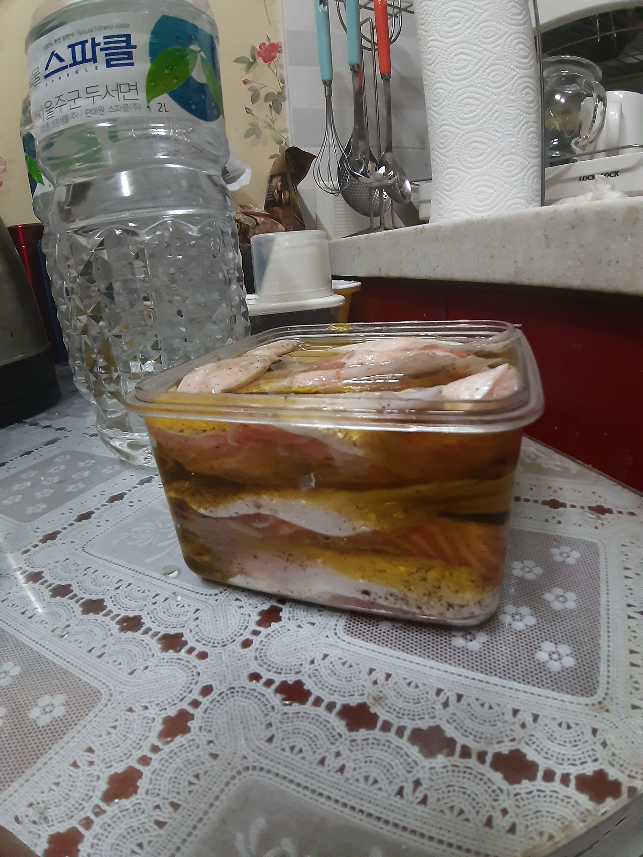 마리네이드 한 연어는 연어 스테이크의 전처리 단계이고, 빠른 시일 내에 저 연어를 구워서 먹으면 된다.