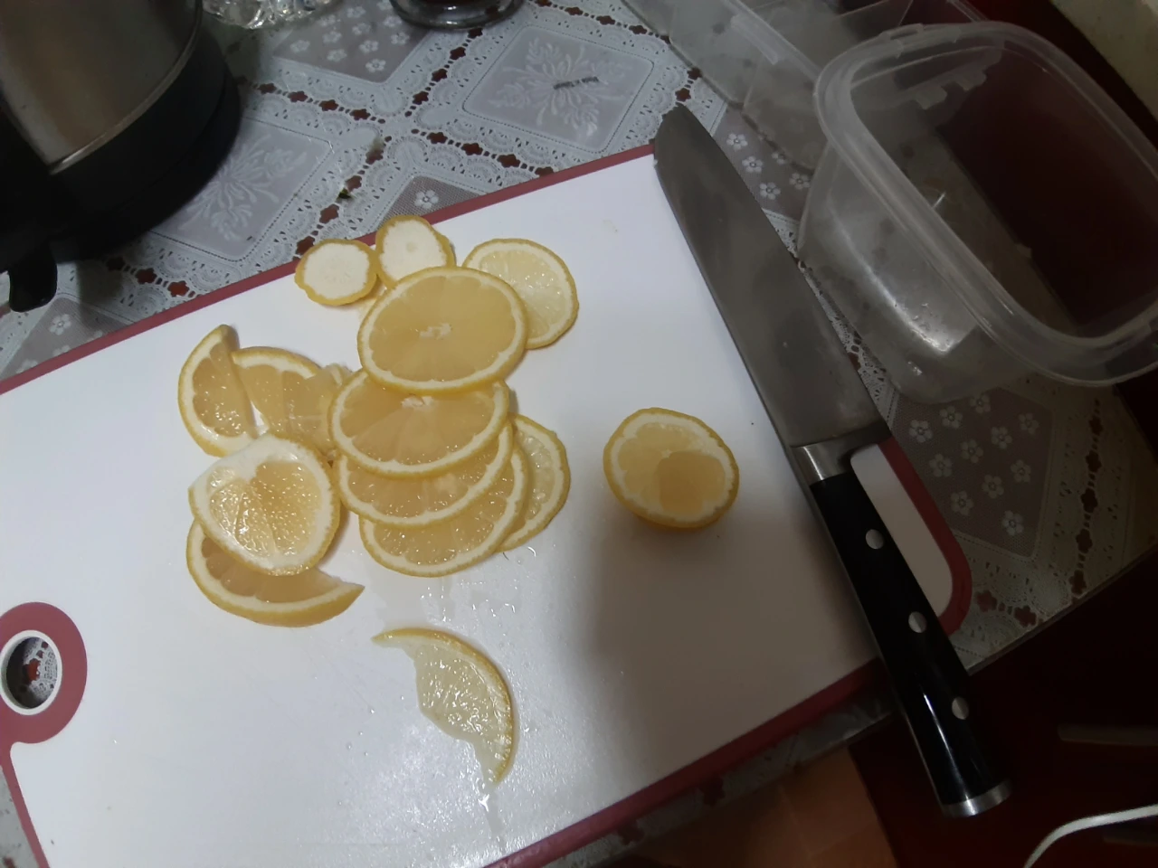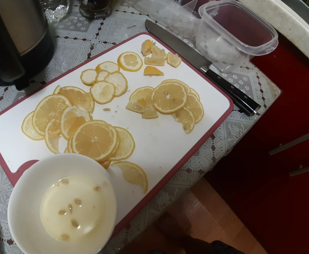 4. 레몬은 두 개를 썼다. 하나는 레몬주스를 만들고 다른 하나는 편으로 썰려고 했는데, 4분의 1만 레몬을 짜내고 나머지를 편 썰었다.