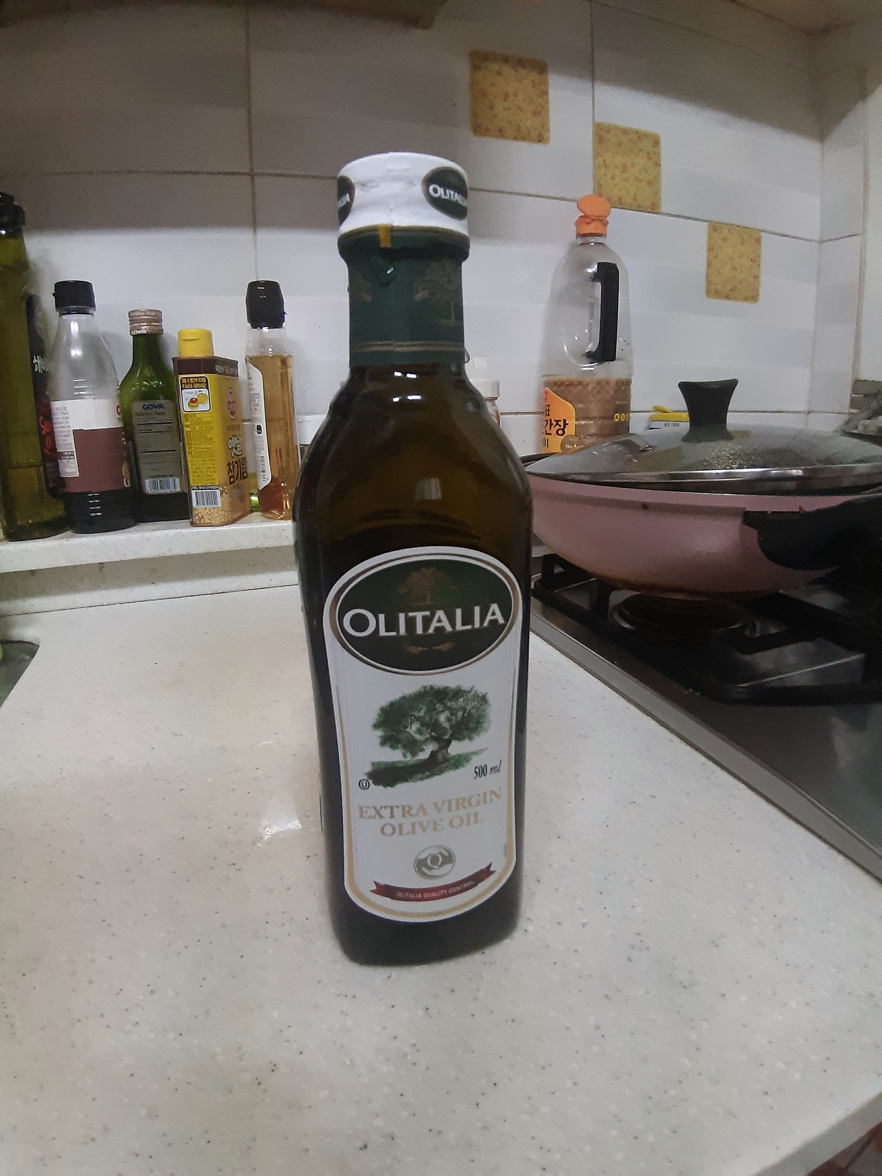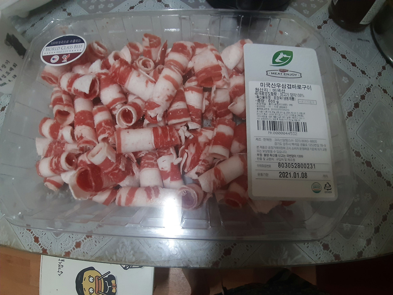 마켓컬리에서 산 100원 우삼겹과 올리브오일.