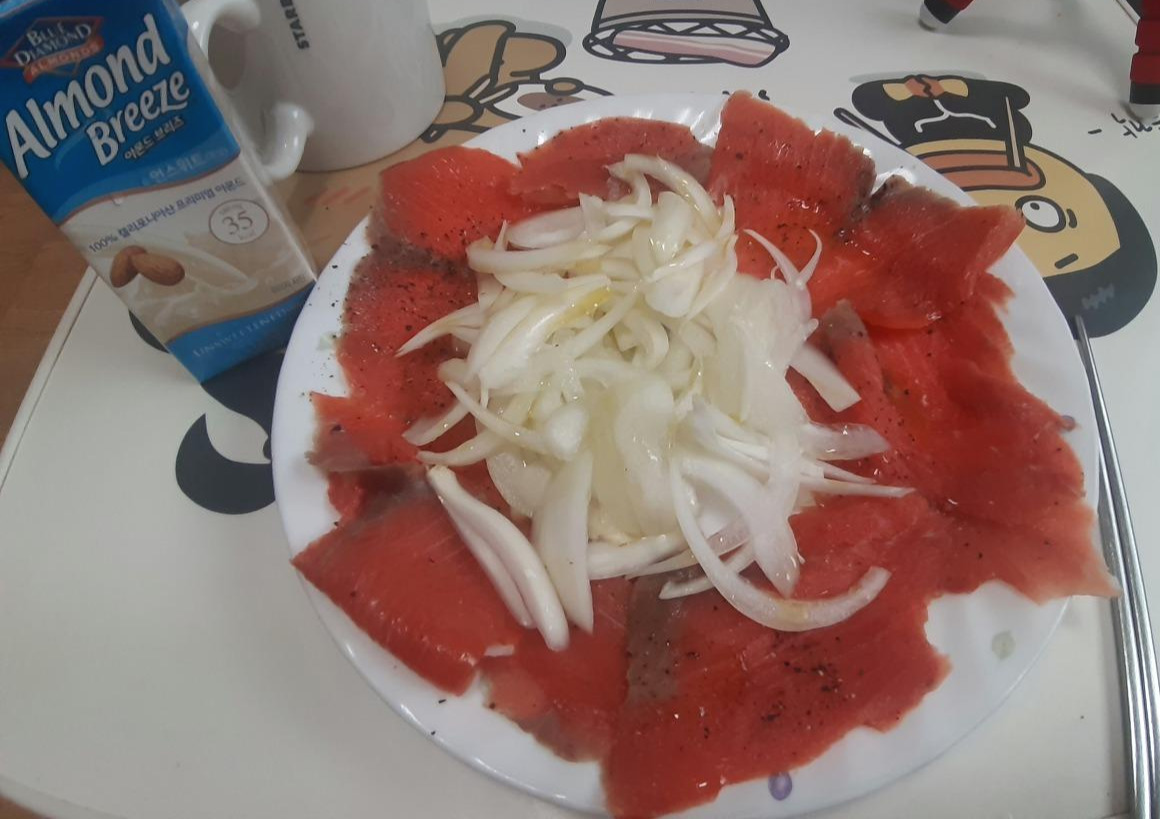 마켓컬리에서 세일하길래 사 본 홍연어입니다. 양식 연어보다 지방이 적고 맛이 깔끔했어요. 샐러드에 올려 먹기 좋은 식재료예요. 매운 기를 뺀 양파와 소금, 후추 그리고 올리브 오일을 곁들여 먹었어요. 맛있는데, 양이 너무 조금이라 하하.. 다음에는 다른 식재료를 도전해보고 싶어요! 세상에 맛있는 것들은 많으니까요.