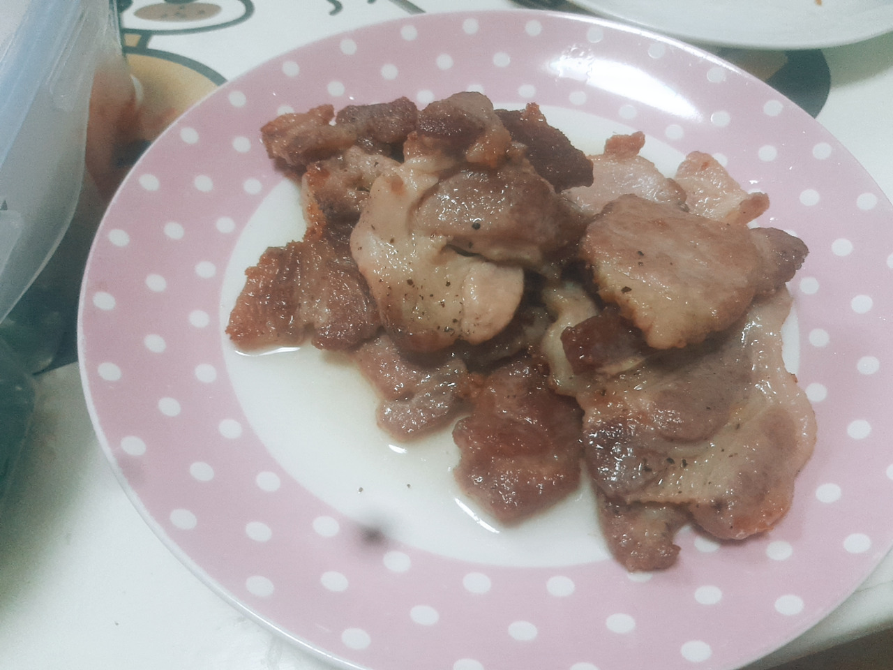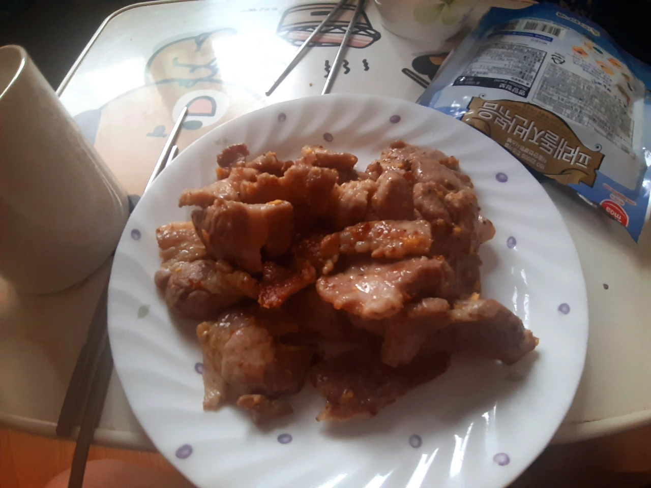 동생 밥을 차려주다가 점심때가 되어서 저도 고기를 구워 같이 먹었어요. 아무래도 동생이랑 같이 있으니까 더 먹게 되는 거 같아요.(웃음) 한참 먹을 때는 둘이 라면 두 개+밥 많이, 삼겹살 두 접시도 거뜬했는데요. 그때 이야기를 하며 맛있게 잘 먹었습니다.