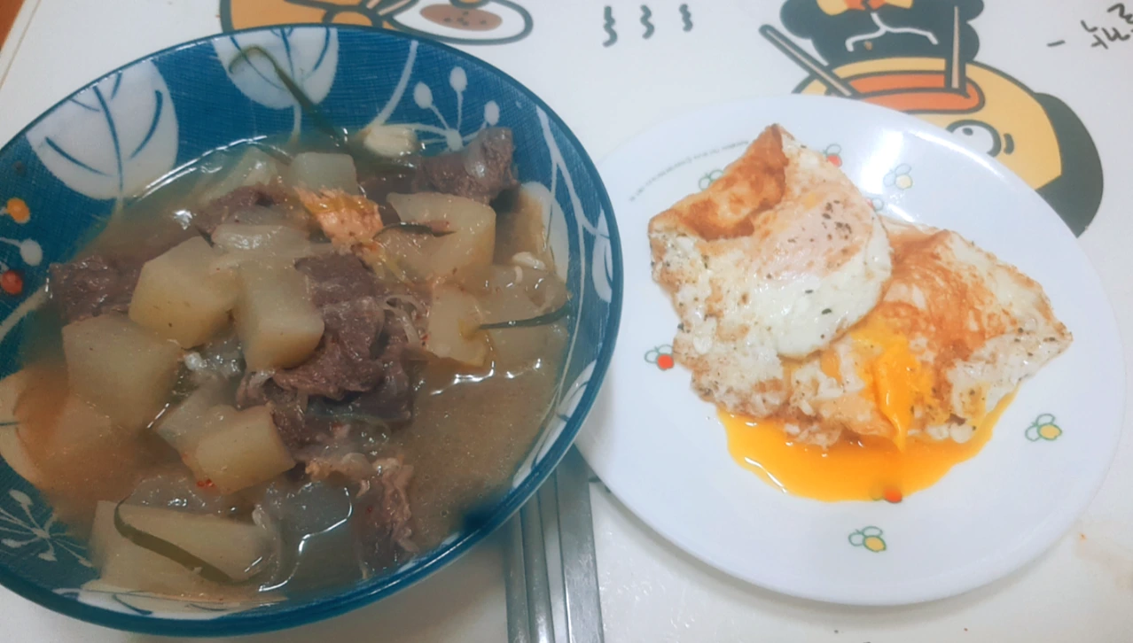 소고기 뭇국과 계란 프라이 두 개.