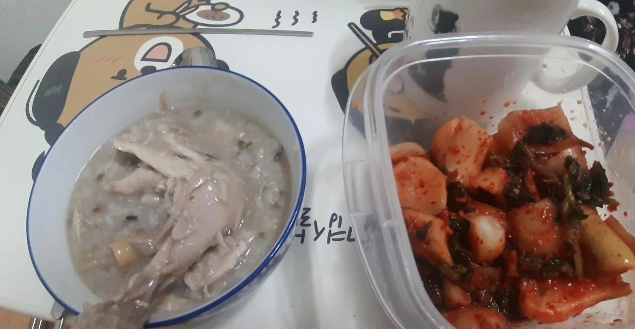 아침에 일어나 보니, 어머니께서 삼계죽을 해주셨습니다. 동생과 맛있게 잘 먹었습니다.