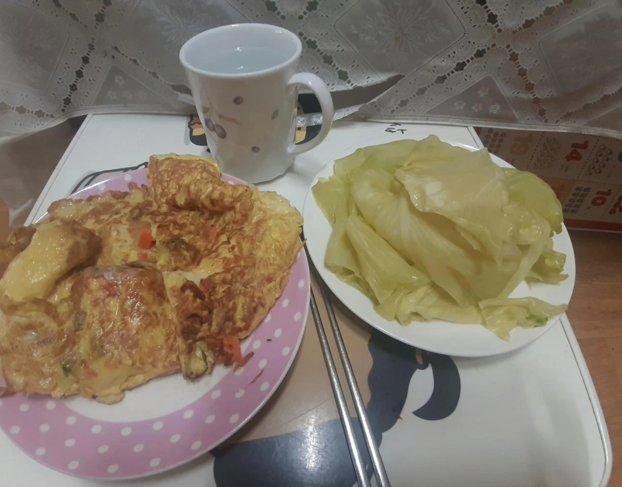 어제 먹고 남겨둔 양배추를 삶아서 다진 야채를 넣은 치즈 오믈렛과 함께 먹었습니다. 아침 식사답고 좋았어요!