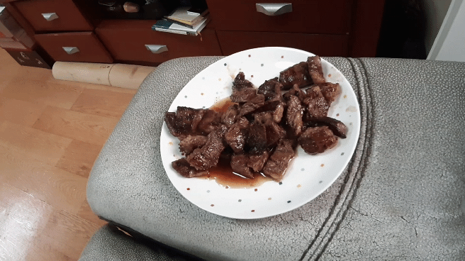 식단은 버터에 구운 고기입니다. 미세하지만 고기 양이 조금씩 줄어드는 것이 보이시나요? 저는 몸이 필요한 만큼 고기를 먹고 있습니다. "진짜 배부르다."라고 생각하면 음식을 그만 먹습니다. 몸의 신호는 정확해서 필요한 영양분 공급이 끝나면 숟가락을 내려놓습니다. 그리고 식단을 오래 하면 할수록 더 건강해져서 먹어야 할 음식의 양이 줄어듭니다. 신기하죠?
