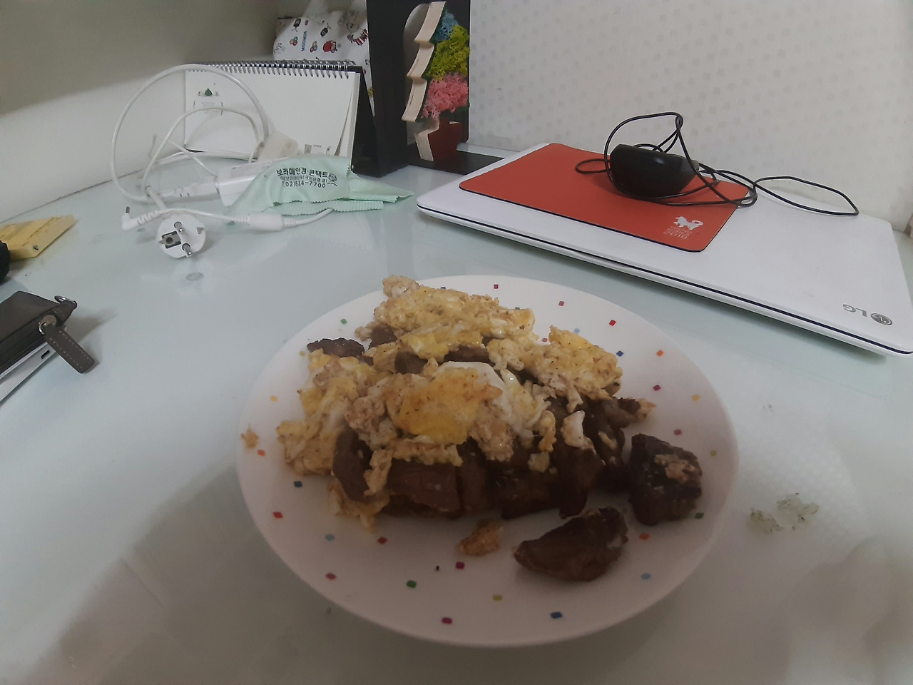 버터에 구운 소고기와 오징어와 스크렘블드 에그와 버터에 구운 소고기를 먹었습니다. 식단이 소고기나 삼겹살 위주여서 단조로울 땐 오징어나 해산물을 먹기도 합니다.(비싸서 자주는 먹지 못합니다ㅠㅠ)