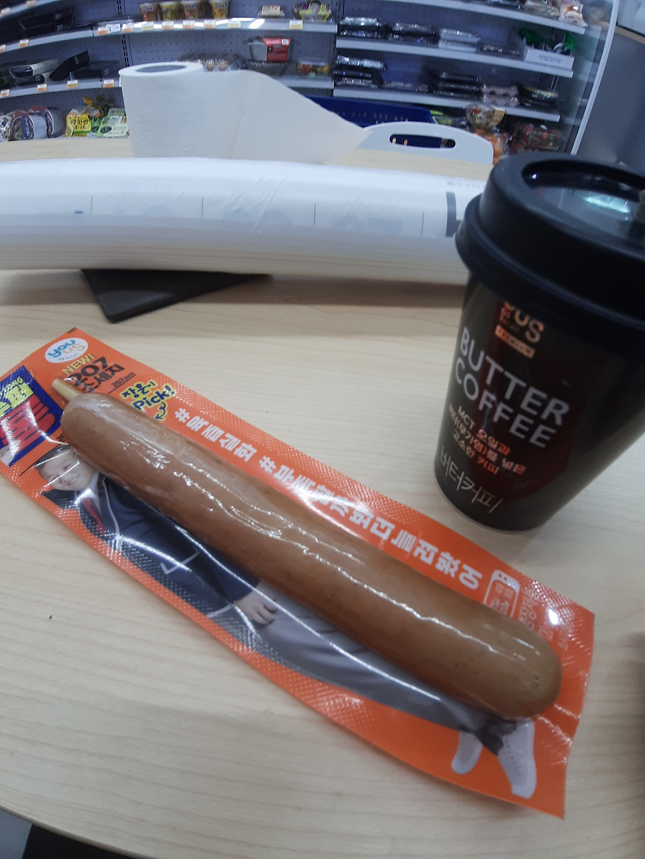 밖에 조금 오래 있어야 할 일이 있어서 GS25 버터 커피와 돼지고기 단백질, 지방 함량이 높은 소시지를 저녁으로 먹었습니다.