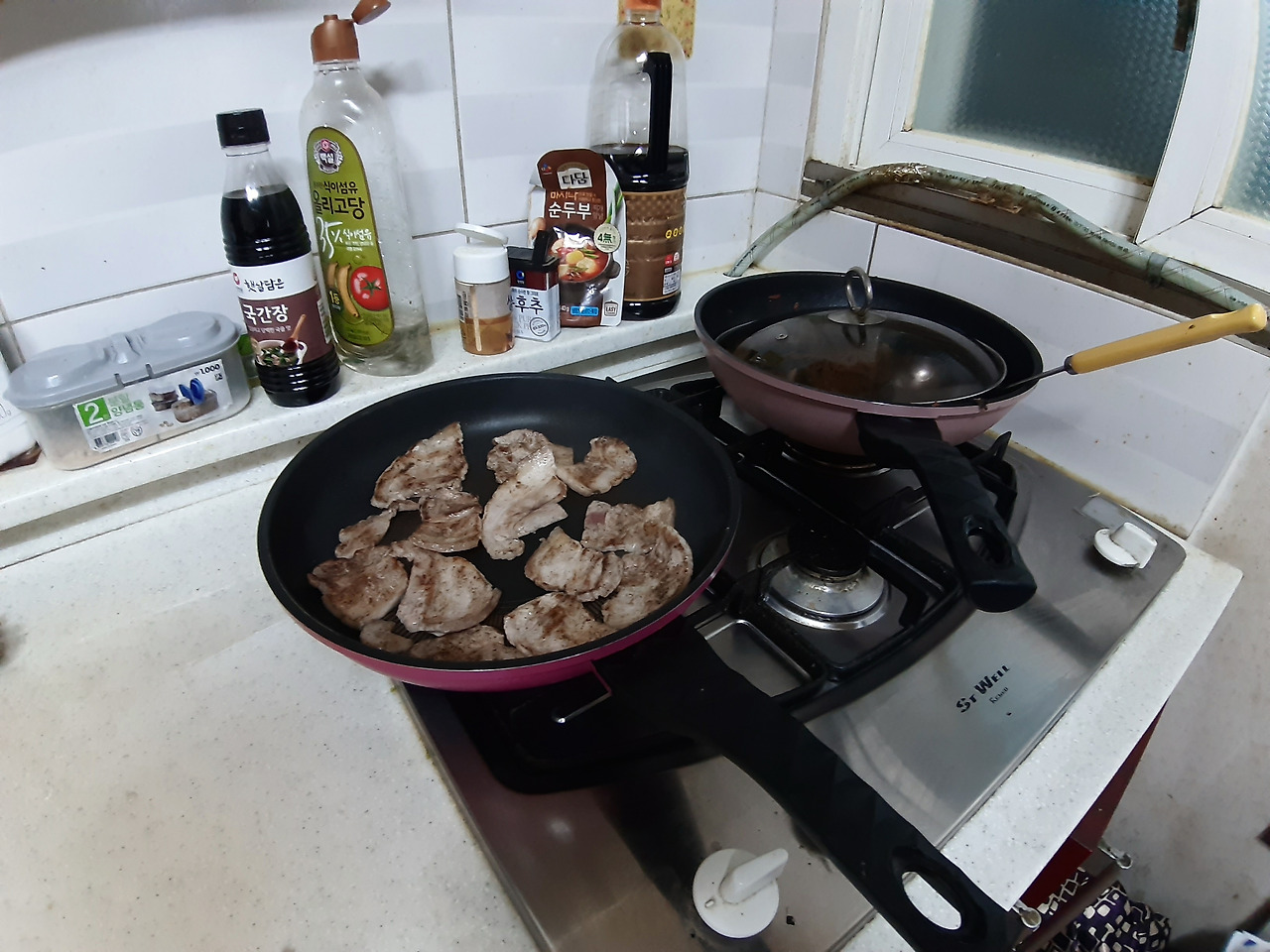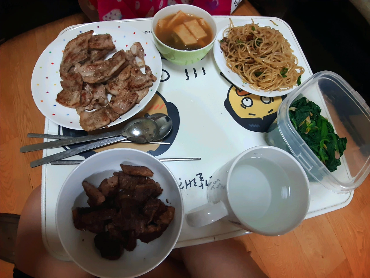 종강하고 살 더 잘 뺄 수 있을 줄 알았는데, 어머니께서 김밥을 싸주셨습니다.(또르륵...) 동생과 사이좋게 나눠먹었습니다. 그리고 동생과의 돼지(종강) 파티! 버터에 구운 소고기, 삼겹살 구이, 시금치나물, 알리오 올리오, 어묵탕을 먹었습니다.