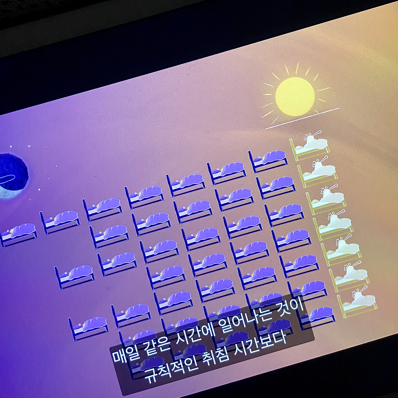 사람마다 수면의 패턴은 다르지만 언제 잠을 드는 것보다 매일 아침 일정한 시간에 일어나는 것은 더 중요하다고 해요. 새벽에 일어난다라기보다는 피곤하더라도 규칙적인 시간에 일어나 아침을 시작하는 것이 수면 리듬에 중요한 포인트라는 것을 이 영상을 통해 알게 되었어요.