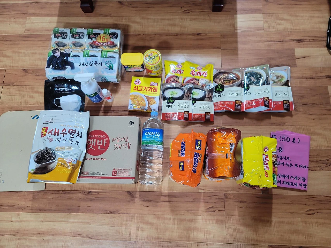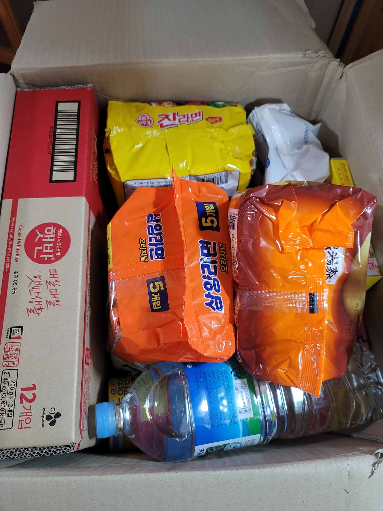 구호물품 꾸러미는 생각했던 것보다 훨씬 실하게 들어있다. 우선 라면과 참치, 햇반으로도 일주일 정도는 넉넉히 지낼만할 것 같다. 거기에 각종 레토르트 식품들이 들어있다.