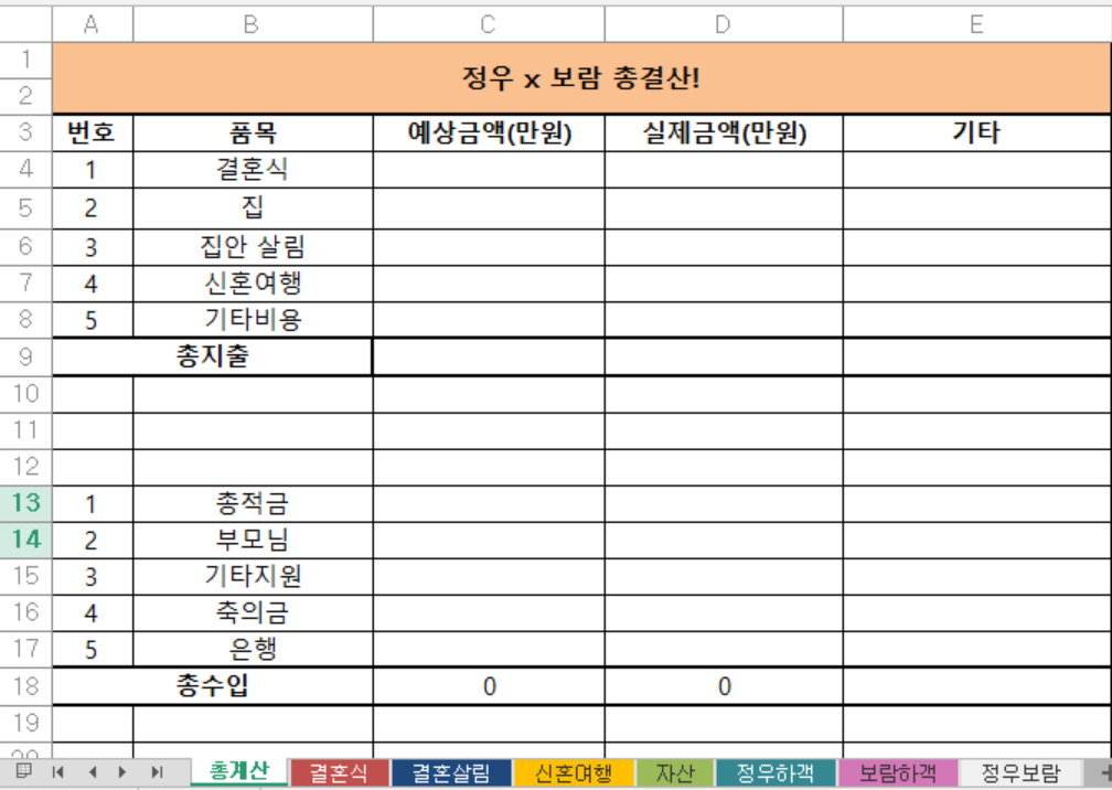 이것이 그 문제의 엑셀. 각 시트별로 다 채우면......결혼이닷!