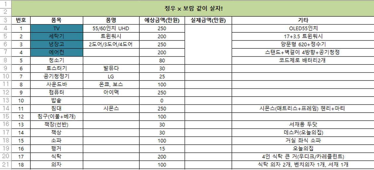 결혼살림 품목. 나의 아이맥은 어디 갔니. 원하는 품목을 브랜드와 종류까지 최대한 구체적으로 찾는다. 그러면 실제 금액과 최대한 가깝게 예상 금액을 적을 수 있다. 물론, 그래도 거의 다 바뀐다.