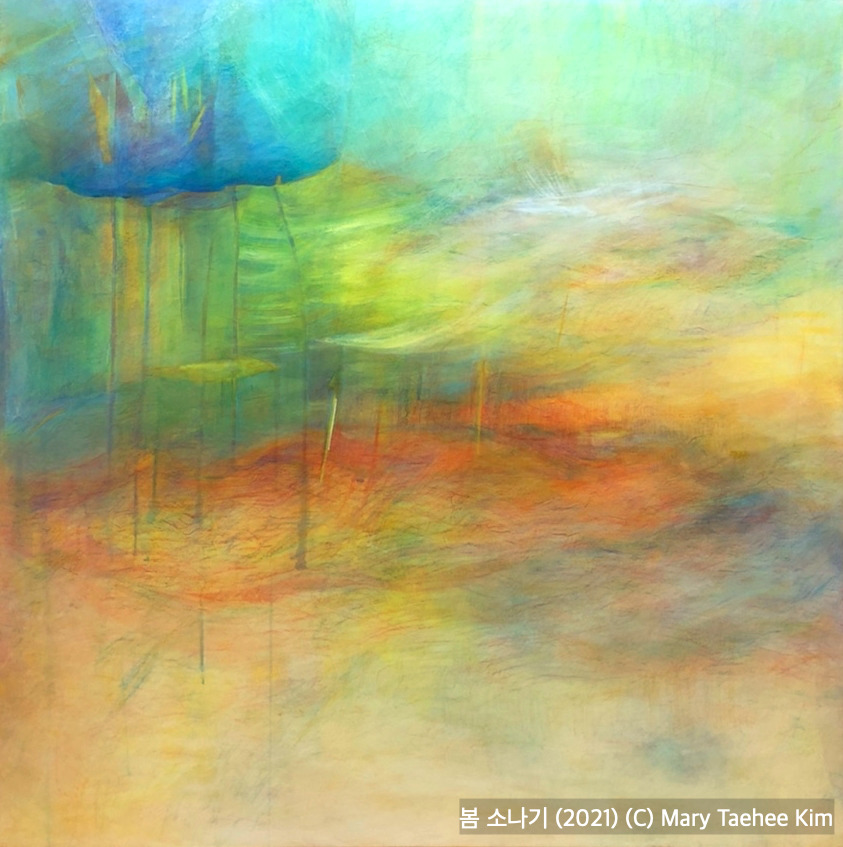 그림의 왼쪽 위에는 겨울의 찬 기운을 잔뜩 머금은 비구름이 있다. 얼음장같이 찬 소나기가 내릴 것 같지만, 생명의 움을 틔우는 따뜻한 연둣빛 봄 소나기가 내린다. 생명의 비를 맞은 땅은 붉은 꽃을 피워내고 있다. 봄 소나기를 가만히 바라보다 보면, 자연도 이렇게 열심히 살아가는데 4년 전 잊지 못할 경험을 한 나는 여전히 치열하고 열정적으로 살아가고 있는지 되돌아보게 된다.