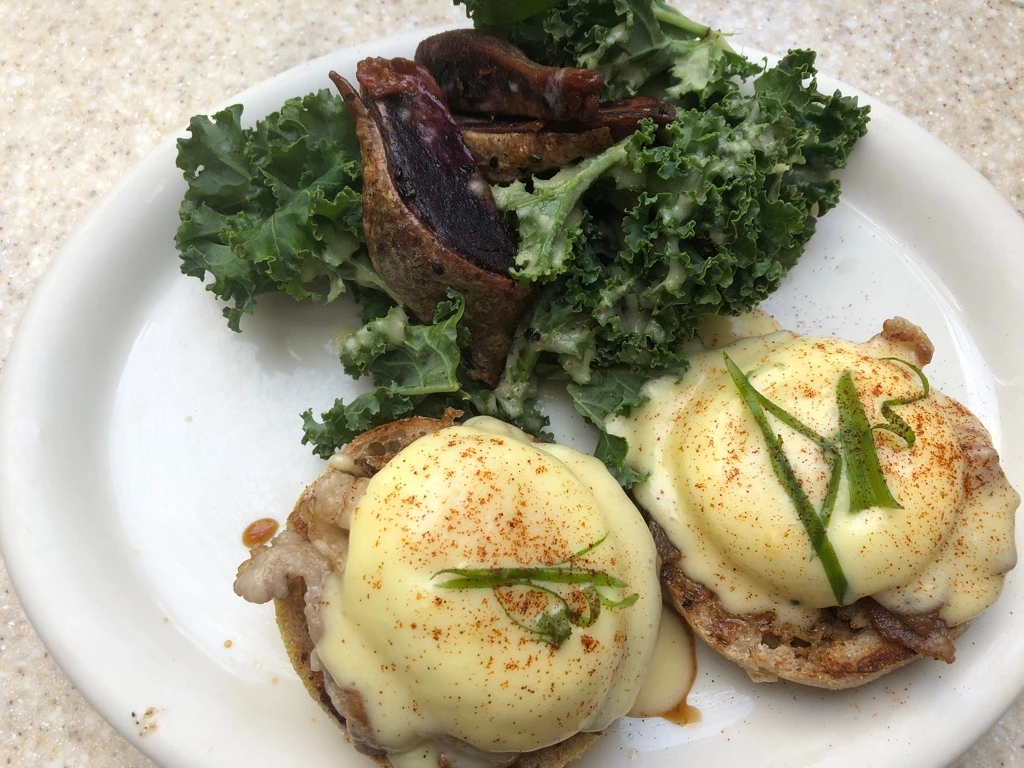 그동안 풍문으로만 들었던 에그 베네딕트 (Eggs Benedict)를 먹어봤습니다. 수란과 홈메이드 홀랜다이즈 (Hollandaise) 소스, 릴리코이 버터 (Lilikoi butter, 패션후르츠 버터), 그리고 오키나와의 보라색 고구마와 신선한 샐러드. 이 모든 조합이 만들어내는 아름다운 화음을 오감으로 느낄 수 있었습니다. Heavenly에는 다양한 에그 베네딕트가 있었고 하나같이 다 맛있었습니다. 그중에서 기억에 남는 에그 베네딕트는 하와이 로컬 돼지고기 요리인 칼루아 포크 (Kālua Pork)가 곁들여진 에그 베네딕트였습니다.