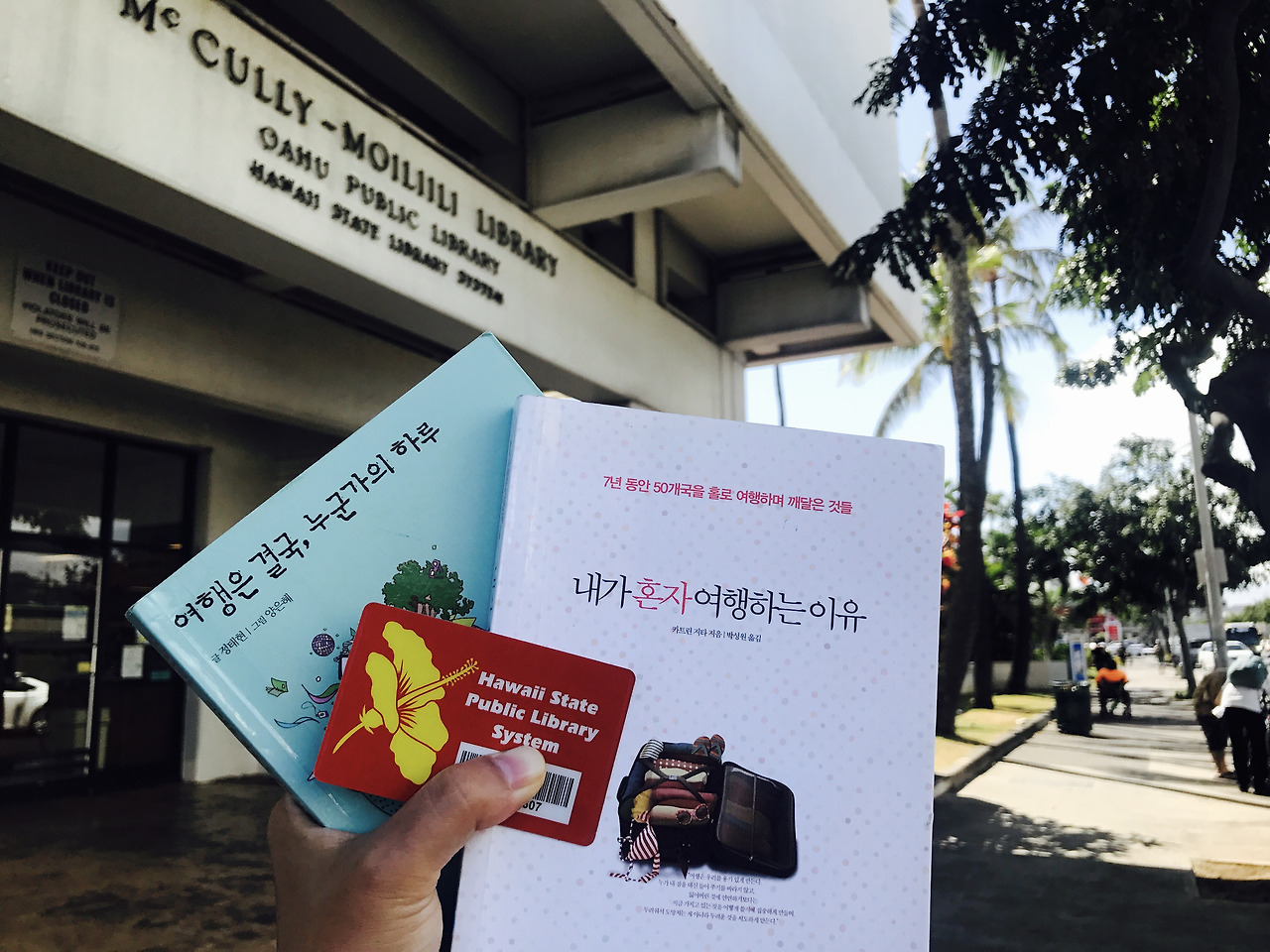 도서관에서 책을 빌렸을 때는 왠지 모르게 뿌듯해졌습니다. 무거운 캐리어에 겨우 넣고 온 여행책자가 아니라, 원하는 책을 선택해 마음껏 읽게 되었으니까요. 숙소 근처인 맥컬리도서관에는 한국 책 코너가 마련되어 있습니다. 생각보다 꽤 많은 책이 마련되어 있는데요. 도서관 카드 덕분에 활자를 훑고 마음에 드는 문장을 가슴에 새길 수 있게 됐습니다. 하와이에 오면 시간에 구애 없이 꼭 여유롭게 책을 읽겠다고 한 다짐을 실천할 수 있게 되었죠.