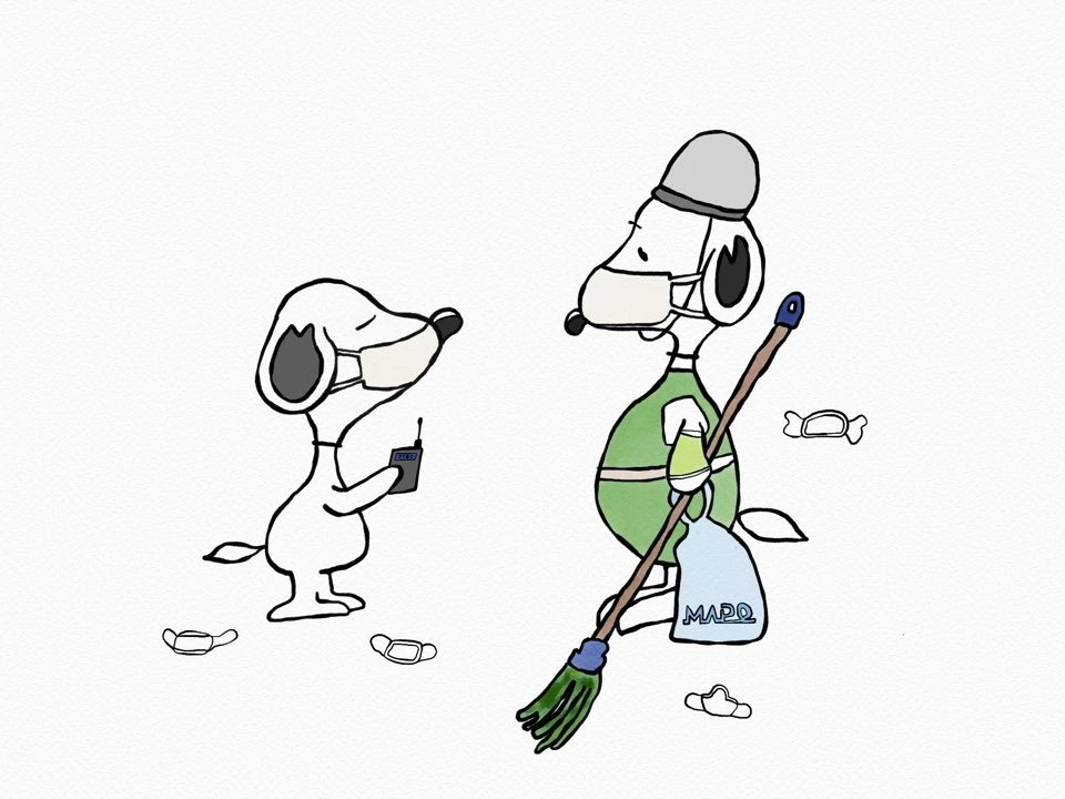 * 사람들이 다 쓴 마스크를 자꾸 길거리에 두고 간다. 까먹는 거 맞지? 버리는 거 아니지? 환경미화원, 공공근로자의 몫이다. 그들은 거리의 안전을 책임지는 이들인데, 되려 그들의 안전이 위협받고 있다. 마스크는 재활용쓰레기가 아닌 소각장으로 가는 종량제봉투에 담아야 한다. 리멤버. 그림은 같이 일한 그녀를 위한 선물.