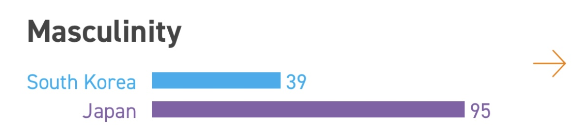 홉스테드의 문화차원이론에서 일본이 전세계 1위를 달리는 항목은 '남성성(Masculinity)입니다. 지수가 높을수록 남성적 사회라는 건데, 한국은 39인 반면 일본은 95에 달하지요. 남성과 여성이라는 생물학적 용어가 등장하다 보니 어떤 의미일지 살짝 의아한 부분이 있을 텐데요. 남성성이 낮다고 해서 양성평등이 잘 이루어진다는 뜻은 아닙니다. 영향은 있을 수 있겠지만, 기본적으론 성 고정적 역할을 얼마나 수긍하느냐의 차이입니다. 남자는 이래야지, 여자는 이래야지, 라는 성고정 관념이 견고할수록 지수가 높은 셈입니다.