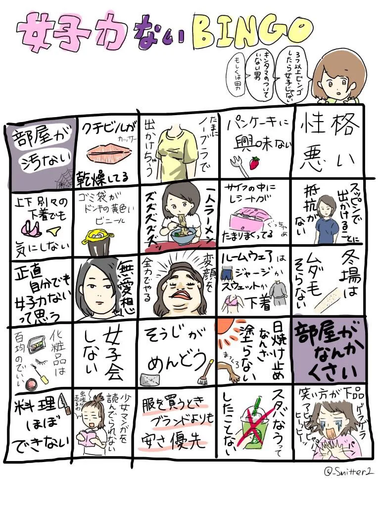 일본 트위터에 돌아다니는 빙고를 가져와 보았어요. 나에게 얼마큼 '여자력'이 있는지 알아보는 테스트인데요. 10개 이상 해당한다면 비로소 '여자의 길'을 걷는 첫 발걸음인 거고, 10개 이하는 쿠소(クソ)라고 하는데요. 쿠소(クソ)는 똥, 찌꺼기, 제기랄, 뭐 이런 뜻을 지닌 일본에서는 상당히 심한 욕설에 속합니다.