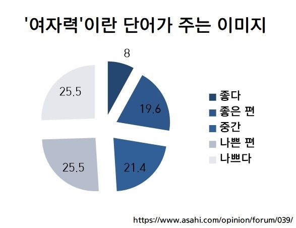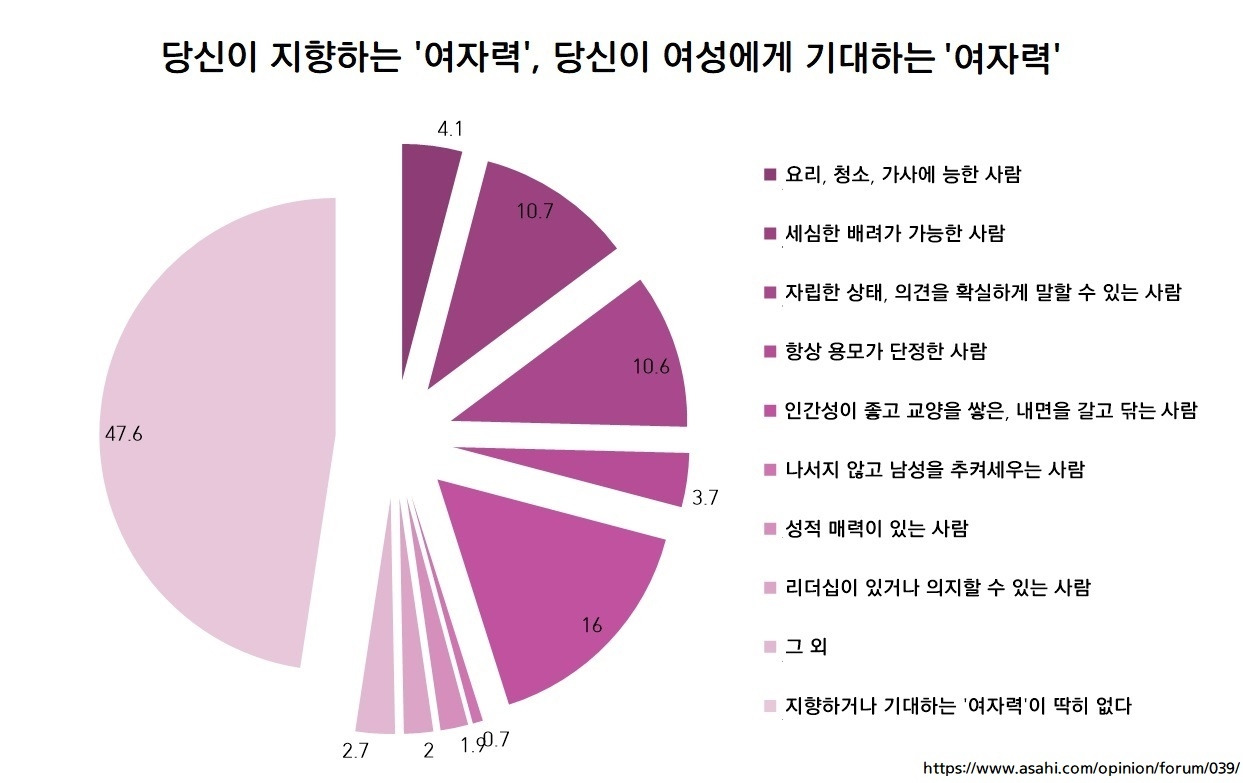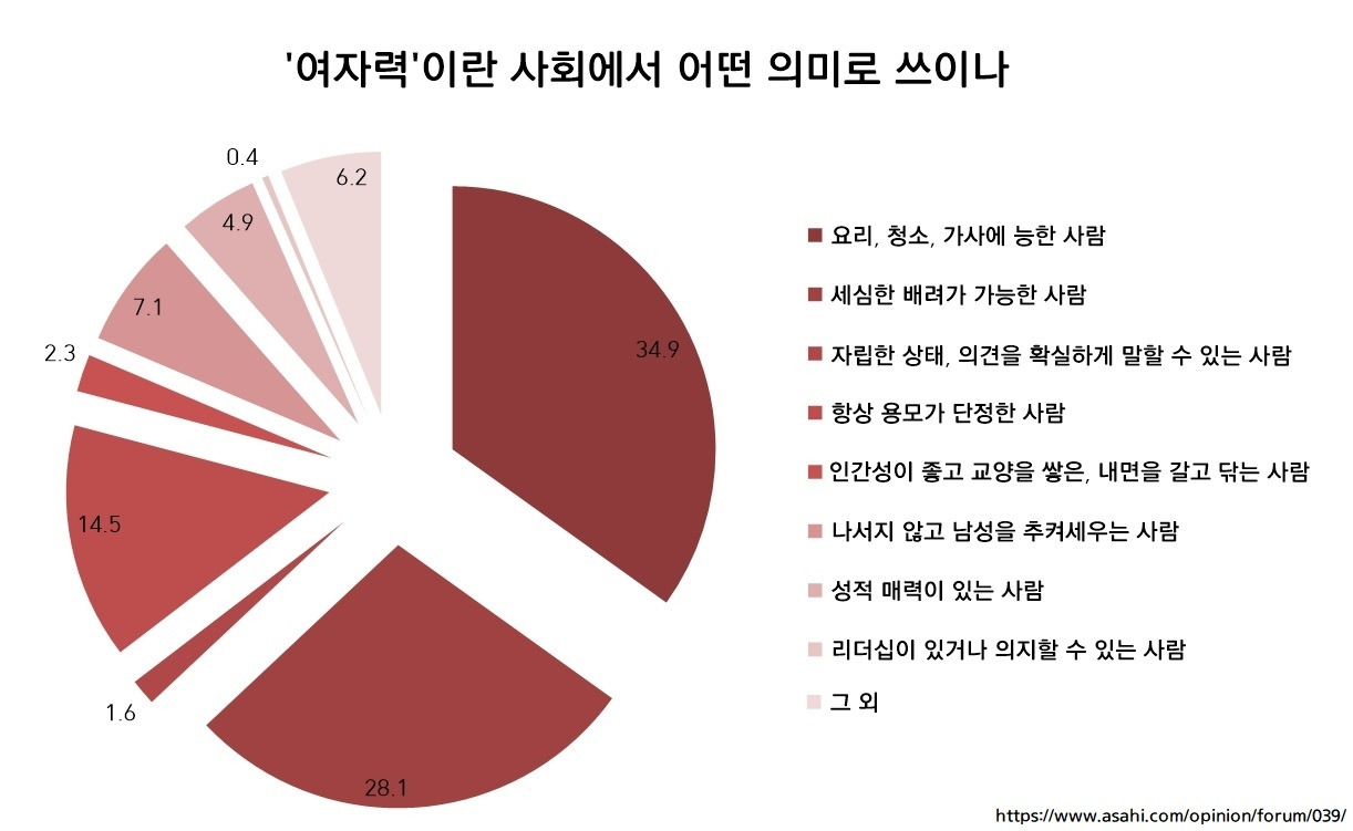 - '여자력'이란? 요리나 청소에 능한 사람(34.9%), 세심한 배려를 보이는 사람(28.1%), 항상 용모가 단정한 사람(14.5). 리더십이 있거나 의지할 수 있는 사람을 택한 건 0.4%에 불과하다는 사실도 흥미롭습니다.
