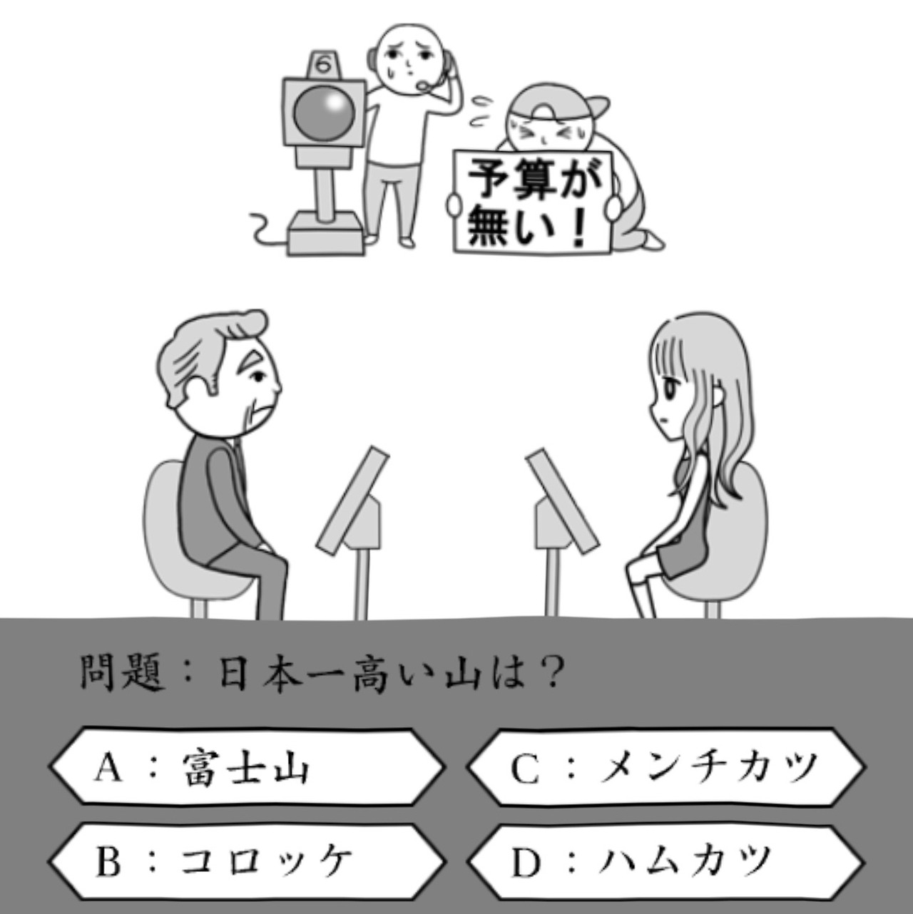 두 사람이 마주 보고 앉아있습니다. 문제를 맞히면 상금을 주는 퀴즈쇼 방송 프로그램입니다. '나'는 문제를 맞히는 사람입니다. 그런데, 카메라 옆 스테프가 '예산이 없다'는 내용의 플래카드를 들고 있지요.