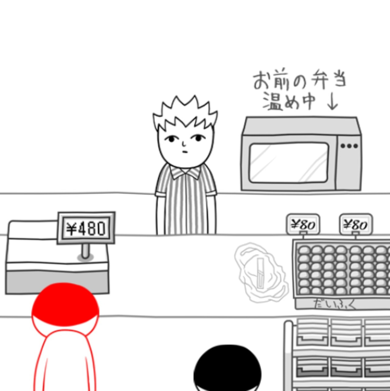 편의점 계산대. '나'는 도시락을 샀고, 직원이 전자레인지로 데워주는 장면입니다. 우리나라는 도시락도 컵라면도 셀프죠. 대개 일본 편의점에선 데워진 도시락과 젓가락을 비닐봉지에 담아주는 일까지 직원의 몫입니다.
