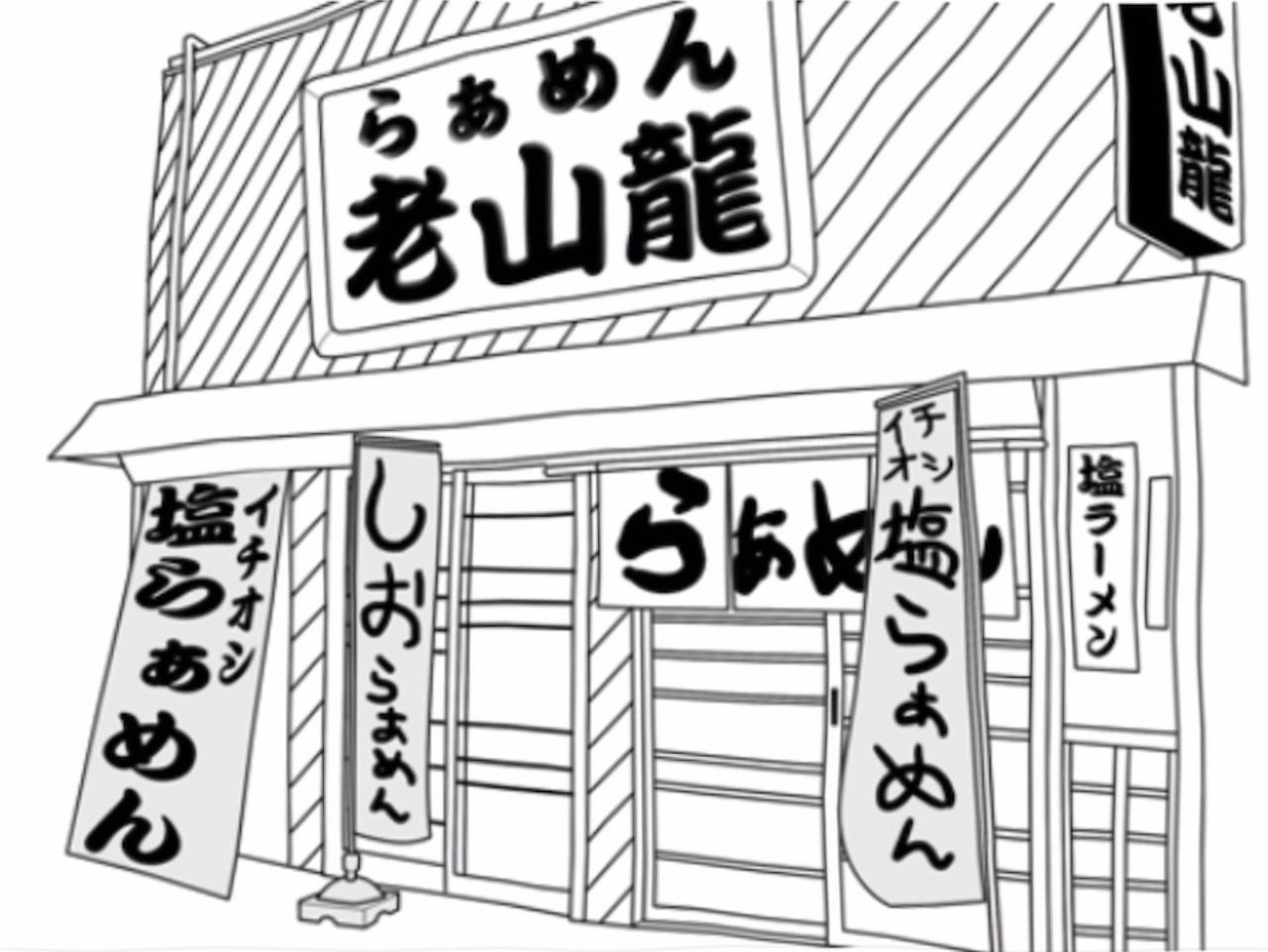 라멘집 앞에 글자들이 많이 보이죠. 맨 왼쪽부터 순서대로 적어보겠습니다.