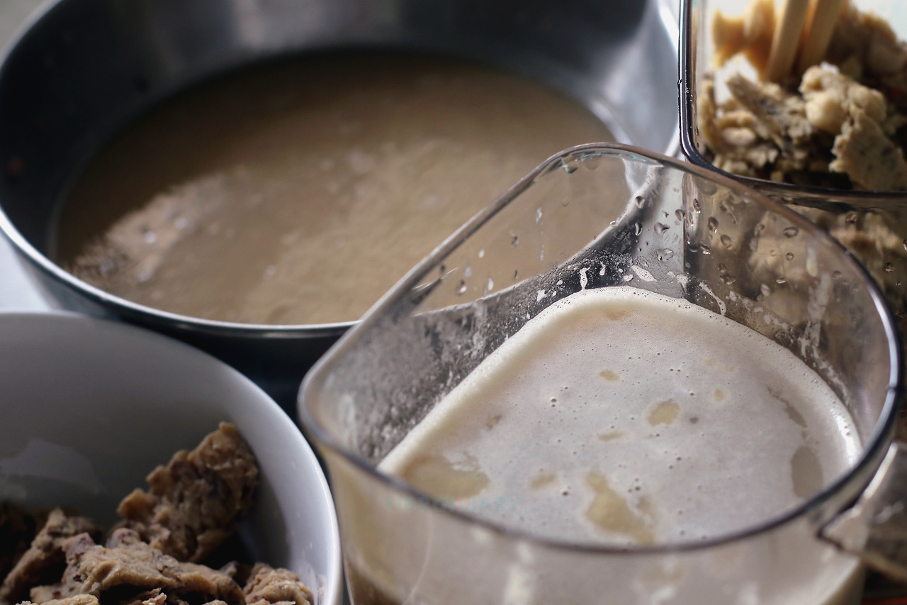 익혀진 콩은 미지근하게 식혀 콩 삶은 물과 함께 착즙기에 넣는다. 콩물과 콩 살을 덜어내기 위해서다. 콩 살은 여러 차례 착즙기로 걸러내어 부드럽게 만든다. 그리곤 소금과 설탕을 작은 숟갈로 덜어 모두 함께 섞는다. 각자가 원하는 간대로 소금과 설탕을 추가로 넣을 수 있지만 그냥 소금간만 조금 하고 만다.