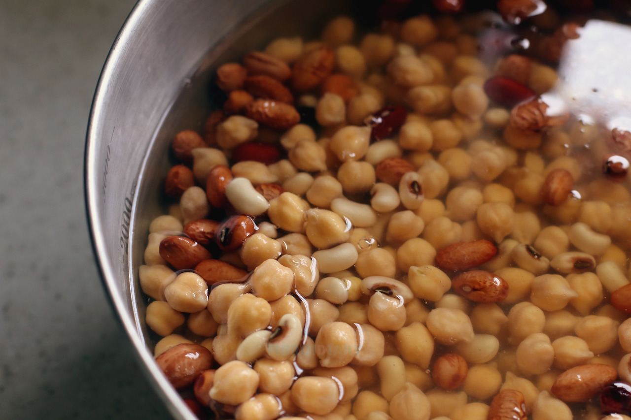 병아리콩 한 주먹, 동부콩 한 주먹, 렌틸도 한 주먹. 집에 있는 모든 콩을 한 주먹씩 넣어 5시간가량 불렸다. 물기를 가득 머금은 콩들이 빛을 받아 반짝거린다. 충분히 불려진 콩들은 끓는 물에 15분가량 삶아 익힌다. 너무 오래 익히더니 콩의 풋내가 올라와 향이 썩 좋지 못했다.