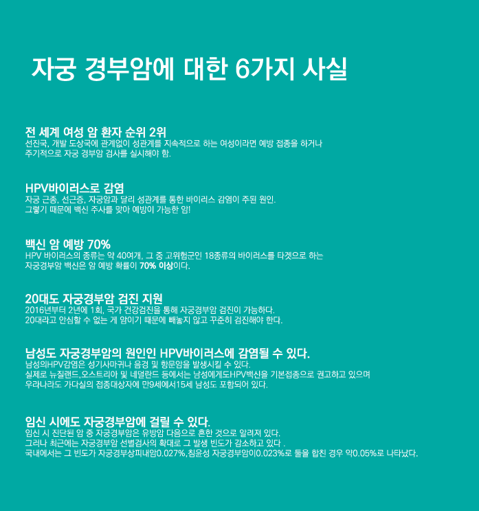 2014년도 기준으로 자궁 경부암은 여성암 중 전체 6위를 차지할 정도로 빈번한 질병이며 40대 이상 여성에게서 많이 발병된다. 젊은 여성에 비해 성경험이 풍부하고 아이를 낳은 경험이 위험 요인이라고 한다. 보통 나이가 있는 여성의 발병이 높다고 알려져 20, 30대 여성은 방심하기 쉬우나 최근 20, 30대 여성 암환자 중 10명 중 1명 꼴로 자궁 경부암을 가지고 있다는 통계 자료를 봤을 땐 안심하기 어렵다.