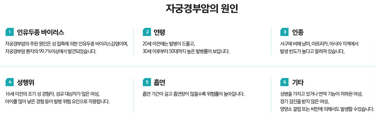 자궁 경부암은 '성관계’로 인한 인유두종 바이러스(HPV 바이러스) 감염의 확률이 매우 높다. 흡연이나 건강 상태도 암 발병의 원인이 될 수 있다고 하지만 자궁 경부암 환자의 99.7%에서 이 인유두종 바이러스가 발견되었으니 원인 관계가 분명한 질병이다. 그래서 자궁 근종, 자궁 선근증. 자궁암, 난소암 등 일반적인 여성 질환과 원인이 다르며 유일하게 예방이 가능한 여성암이다. 너무 빠른 성관계도 문제며 다양한 파트너와의 성관계도 문제다. 또한, 나의 파트너도 문란한 성관계를 할 경우 바이러스를 보균하게 되고 나에게 옮길 가능성이 있다.