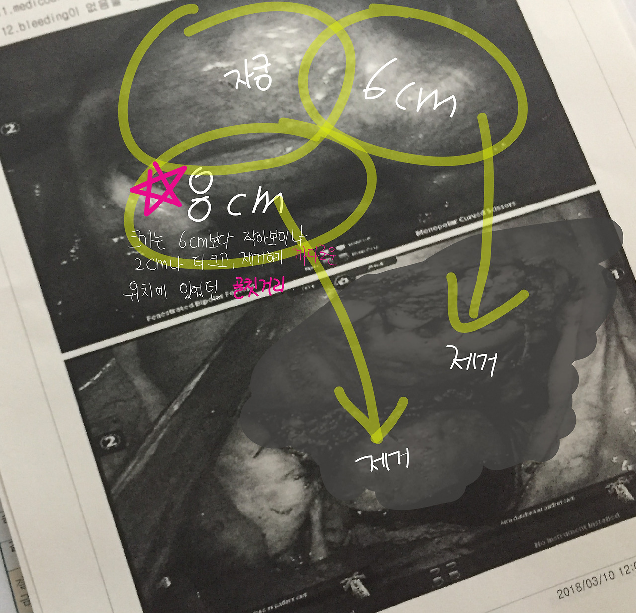 어쨌든 처음부터 개복보단 로봇수술을 원했습니다. 이게 신의 한 수였어요. 8cm가 넘는 골칫거리 근종 녀석이 허리, 엉덩이 쪽에 있고 자궁 경부와 가까워 로봇 수술로도 꽤나 애를 먹었나 봅니다. 일반 복강경이었으면 개복으로 수술을 변경했을지도 몰랐어요.