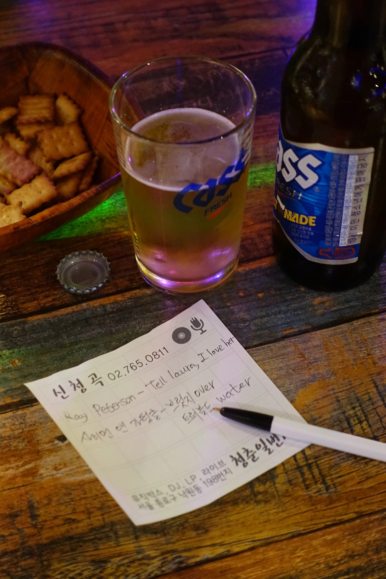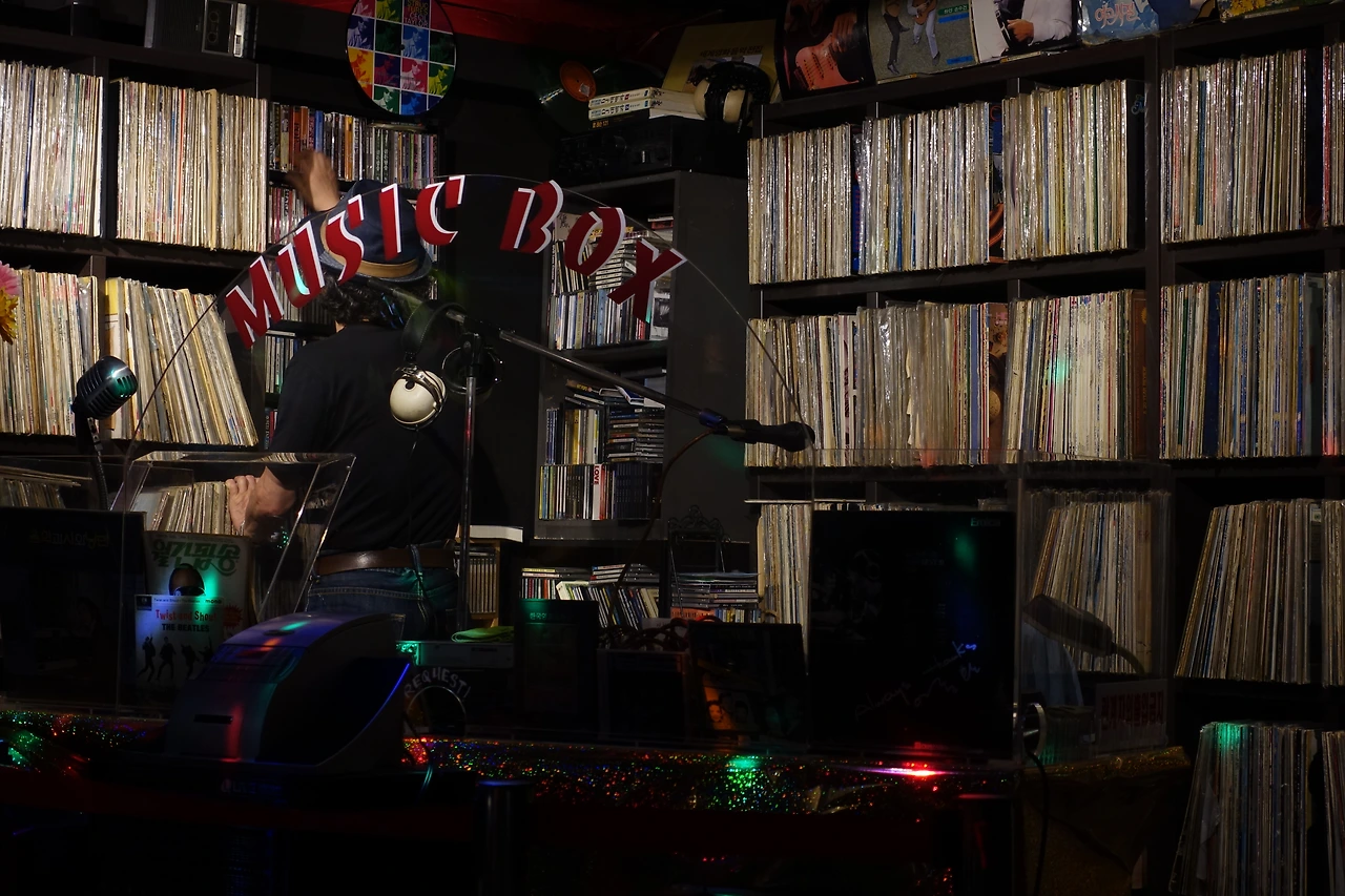 뮤직박스와 디제이가 있는 '청춘1번지'. 나는 간판을 보자마자 이 집을 좋아하게 될 거라 확신했고, 확신은 적중했다. 노래방용 미러볼이 요란히 빛나며 어두컴컴한 가게 안 테이블을 이쪽저쪽 비추고, 공간 가장 안쪽에 마련된 앙증맞은 뮤직박스 안에 백발의 디제이가 있는 곳이었다. 번데기탕과 맥주를 주문한 뒤 본격적으로 신청곡을 적었다. M이 유난스레 수줍어하며 건넨 종이를 받아든 디제이는 44년차 경력에 걸맞은 노련한 손놀림으로 LP를 집어들었다. 자, 새로운 테이블의 신청곡입니다. 로라에게 말해주세요, 사랑한다구요.