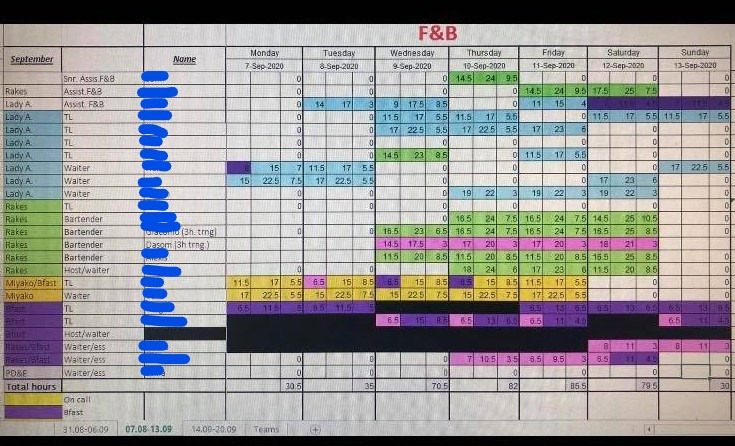 호텔 소유의 다섯 개 아울렛 중 세 곳이 8월 중반부터 영업을 재개했다. Y와 내가 함께 일한 일식당도 그중 하나. 입사 3년 차인 그는 호텔이 문을 다시 열자마자 가장 먼저 투입된 인력 중 한 명이었다. 본래 백여 명이 훨씬 넘었던 F&B 부서 인원은 Y가 돌아갔을 때 스무 명 남짓이 되어있었다. 어느 팀이나 사람이 절반 이하로 줄었을 뿐 아니라 룸서비스팀, 직원 식당팀, 조식 준비팀처럼 아예 통째로 소멸해버린 팀도 많았다. 수 년 혹은 수십 년을 이곳에서 일한 사람들 다수가 인사할 기회도 없이 떠난 자리에 비교적 젊고 연차가 짧으며 여러 일을 맡을 수 있을 법한 이들이 채워졌다. 회사는 우리를 ‘Key Worker’, 또 ‘Skeleton Crew’라 불렀다.