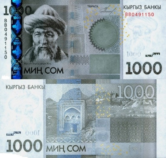 키르키스스탄 화폐 중 큰 단위에 속하는 1000솜과 5000솜에는 가장 오래된 인물과 가장 최근에 실존했던 인물이 나와있다. 1000솜 앞면에 있는 유수프 발라사긴(Jusup Balasagyn)은 11세기에 살았던 유명한 학자이다. 키르기스스탄 사람들은 학자 유수프를 그가 태어난 도시 이름 발라사긴을 붙여 함께 부르고 있지만, 외국에서는 ‘유수프 하스 하집(Yusuf Has Hacip)’이라는 이름으로도 알려져 있다.