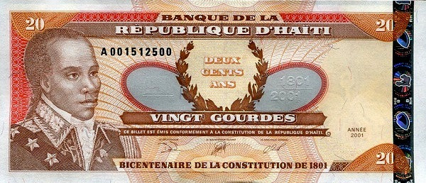 아이티 독립의 불을 태운 사람은 20구르드(HTG) 앞면에 사진이 있는 투생 루베르튀르(Toussaint Louverture)이다. 노예로 태어난 루베르튀르는 착한 프랑스 지주 아래서 자랐다. 그가 매우 똑똑하다는 것을 눈치 챈 프랑스 지주는 루베르튀르에게 논이 아니라 별장에서 일을 시켰다. 그나마 편하게 일할 수 있었던 루베르튀르는 많은 책을 읽으며 지식을 쌓았다. 프랑스에서 1789년 혁명이 일어나자 프랑스 식민지인 아이티에서는 자유를 얻은 흑인들끼리 투표권과 평등권에 대한 목소리가 높아졌다. 그러던 어느 날 1791년 아이티에서 노예들이 큰 반란을 일으켰다. 반란 와중 루베르튀르는 반군의 지도자가 되었고, 반란을 독립 전쟁으로 발전시켰다. 독립 전쟁 중에는 루베르튀르가 지도하는 반란군이 때로는 프랑스군과, 때로는 영국군과 전쟁을 벌였다. 거의 10년 걸친 독립 투쟁 끝에 1801년 루베르튀르는 자신이 만든 헌법과 함께 아이티의 독립을 선포했다.