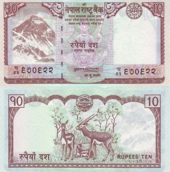 10루피 뒷면을 보면 여타 네팔 화폐들과 다른 특성이 보인다. 네팔 화폐 뒷면에는 주로 산을 배경으로 동물 사진이 있다. 그러나 10루피 뒷면은 숲을 배경으로 검정 영양 3마리가 그려져 있다. 인도 지역에선 과거 국왕들이 검정 영양 사냥을 무척 좋아했다고 한다. 이런 이유로 귀족들이 검정 영양을 사냥하기 위해 치타를 키우기도 했다. 특히 무굴제국 제3대 황제 악바르는 검정 영양 사냥을 너무 좋아해 치타를 1000마리나 키웠다는 전설도 있다.