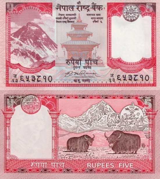 핑크 색깔 5루피 뒷면을 보면 풀을 먹고 있는 야크 2마리가 그려져 있다. 야크는 주로 히말리야 산맥 주변에 사는데 털이 긴 소의 일종이다. 야크는 원래 수컷을 의미하며, 암컷은 나크라고 한다.